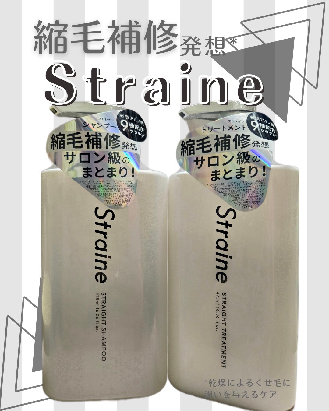 - “straight(真っ直ぐ)”と“line(線)”を組み合わせた造語「Straine」は、まるで一本の美しいラインのようにしなやかで整ったストレートヘアをイメージ。理想のストレート質感を目指し厳選した補修成分と内部構造に着目した独自の補修設計技術で、乾燥によるクセ・うねりケアに悩むすべての人へ、新しい自分との出会いをお届けする新ヘアケアブランドです。  ️髪の内部構造に着目した、独自の「トリプルストレート処方」 縮毛補修発想。髪の内側の構造に着目し、まっすぐまとまる髪を科学的に研究し導きだした3つの処方。 髪の構造を深く理解したアプローチで髪質を再整*1し、潤いを保ちながら、滑らかな指通りへ。 9種の必須アミノ酸*2と7種のケラチン*3を贅沢に配合し、髪内部を補修をしながら、理想の“シルクストレート質感*4 ”を目指します。  ️POINT01|内部補修 -髪内部のうねり原因を補修。まっすぐな髪を目指して。 髪のうねりの原因となる乾燥による内部構造の乱れを、必須アミノ酸*2を含むアミノ酸と密度補強成分「ジマレイン酸」*5で補修。さらに、縮毛補修発想から生まれた成分「トステア®」*6を配合し、ハリ・コシのあるストレート髪を目指します。  ️POINT02|シルク質感 ‐ダメージを立体補修 ダメージによって生まれた髪内部の空洞“ダメージホール”を、保湿成分である7種類の分子量の異なるケラチン*3が髪芯部まで浸透し、立体的に内側まで補修。PPT系高級洗浄成分*7が、髪1本1本を洗い上げ、しなやかで指通りなめらかな“シルクタッチ”の髪へと仕上げます。  ️POINT03|うるおいバリア ―湿気や熱から髪を守る 湿気によるうねりを防ぐために、5種のセラミド*8とサクラン®*9で髪内部の水分をキープ。さらに、熱に反応してバリアを形成する「γ-ドコサラクトン」*10と、キューティクルを保護する「擬似18-MEA」*11が外的ダメージから髪を守り、湿気から髪を保護しながらストレート状態を長時間キープします。  ️凛とした透明感が香り立つホワイトブロッサムの香り サロン帰りのような心地よさを、毎日のバスタイムに。フレッシュなフローラルと果実の爽やかさが調和した、みずみずしく上品な香りです。 *1 うるおいにより、髪の質感を整えること *2 バリン、トレオニン、イソロイシン、ヒスチジン、フェニルアラニン、ロイシン、リシンHCl、メチオニン、トリプトファン(全て保湿) *3 加水分解ケラチン(カシミヤヤギ)、ヒドロキシプロピルトリモニウム加水分解ケラチン(羊毛)、(ジヒドロキシメチルシリルプロポキシ)ヒドロキシプロピル加水分解ケラチン(羊毛)、ココジモニウムヒドロキシプロピル加水分解ケラチン(羊毛)、イソステアロイル加水分解ケラチン(羊毛)、加水分解ケラチン(羊毛)、ケラチン(全て保湿) *4 うるおいによる、なめらかな質感のこと *5 ジマレイン酸プロピレンジアンモニウム(保湿) *6 アミノエチルチオコハク酸ジアンモニウム(保湿) *7 ココイル加水分解ケラチンK(羊毛)(洗浄) *8 セラミドNG、セラミドAP、セラミドAG、セラミドNP、セラミドEOP(全て保湿) *9 スイゼンジノリ多糖体(保湿) *10 (保湿) *11 セテアラミドエチルジエトニウム加水分解コメタンパク、ラノリン脂肪酸(保湿)