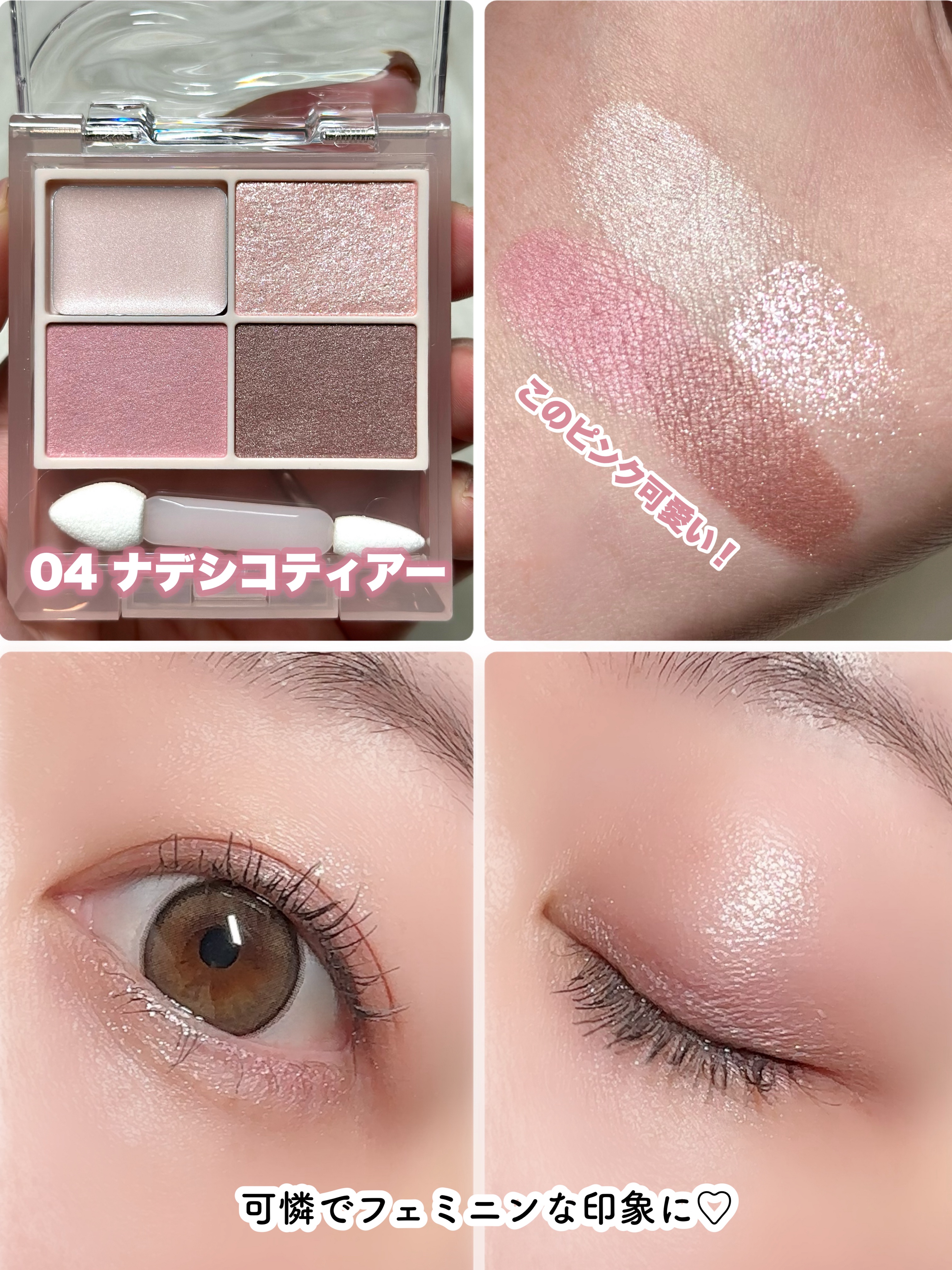 - 粘膜拡張カラーでうるちゅる目もとに 理想の顔に整えるアイカラーパレット 血色感を仕込んだ「粘膜拡張」カラーが大きな目もとを演出 ◇透け感のある血色カラーが粘膜を拡張し、涙袋をぷっくりとみせ、ナチュラルで大きな目もとに仕上げます。 透明感と高発色を両立した色設計 ◇にごりにくく自然なグラデーションを作る色設計で、透明感のある目もとを演出。 ◇さらに、しっとりと密着する高発色処方で、透明感と高発色の両立を実現します。 光を操る “うるきら”ラメで 、ちゅるんとした目もとに ◇うるうる&きらきらに輝くガラスパール配合で、目頭や上まぶた、涙袋などに光を集め、ちゅるんとうるんだ目もとを演出。 異なる質感と処方で、簡単に大きな目もとに仕上げるパレット設計 ◇異なる質感・処方が特徴の4色<コントロールカラー>・<透け感血色カラー>・<ふわ締めカラー>・<うるきらラメ>が入ったパレット。 ◇アイカラーベースの効果やしっとり高密着な処方により、ヨレを防ぎ、塗りたての美しい仕上がりを長時間キープします。