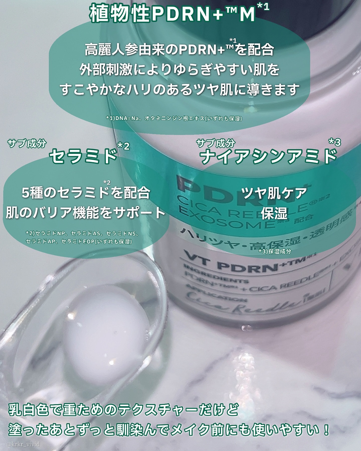 - ハリのない肌コンディションを整える スペシャルPDRN+™×美容針×エクソソーム(全て整肌)配合でハリケア 水分感のあるもちっとミルキーセラムがピタッとなじみ、肌にツヤ感を与える。 さらにツヤ美容成分をプラス! ・ナイアシンアミド: ツヤ肌ケア、保湿 ・セラミド : 肌バリアサポート、乾燥・肌荒れ防止 洗顔後、適量を取り、肌のキメに沿ってやさしくなじませます。