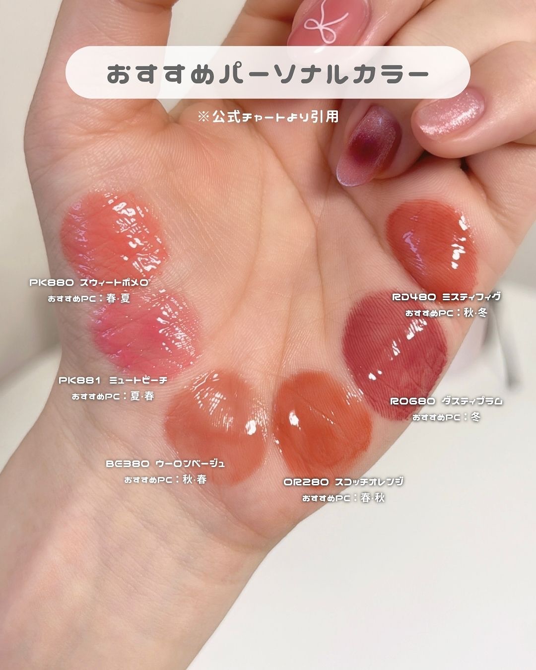 - <BE380 ウーロンベージュ> ダイマージリノール酸ダイマージリノレイルビス(ベヘニル/イソステアリル/フィトステリル)、リンゴ酸ジイソステアリル、ビスジグリセリルポリアシルアジペート-2、デカイソステアリン酸ポリグリセリル-10、トリイソステアリン酸ポリグリセリル-2、ジイソステアリン酸ポリグリセリル-3、ポリブテン、トリメリト酸トリトリデシル、ダイマージリノール酸ジオクチルドデシル、パラフィン、マイクロクリスタリンワックス、トコフェロール、モモ花エキス、BG、(エチレン/プロピレン)コポリマー、(セバシン酸/イソパルミチン酸)ジグリセリル、オクチルドデカノール、カプリル酸グリセリル、ジイソステアリン酸ポリグリセリル-2、ジステアルジモニウムヘクトライト、スクワラン、プロパンジオール、メントール、メントキシプロパンジオール、合成ワックス、水、炭酸プロピレン、香料、酸化チタン、酸化鉄、黄4、赤202 <OR280 スコッチオレンジ> ダイマージリノール酸ダイマージリノレイルビス(ベヘニル/イソステアリル/フィトステリル)、リンゴ酸ジイソステアリル、ビスジグリセリルポリアシルアジペート-2、デカイソステアリン酸ポリグリセリル-10、トリイソステアリン酸ポリグリセリル-2、ジイソステアリン酸ポリグリセリル-3、ポリブテン、トリメリト酸トリトリデシル、ダイマージリノール酸ジオクチルドデシル、パラフィン、マイクロクリスタリンワックス、トコフェロール、モモ花エキス、BG、(エチレン/プロピレン)コポリマー、(セバシン酸/イソパルミチン酸)ジグリセリル、オクチルドデカノール、カプリル酸グリセリル、ジイソステアリン酸ポリグリセリル-2、ジステアルジモニウムヘクトライト、スクワラン、プロパンジオール、メントール、メントキシプロパンジオール、合成ワックス、水、炭酸プロピレン、香料、酸化チタン、酸化鉄、赤202 <PK880 スウィートポメロ> ダイマージリノール酸ダイマージリノレイルビス(ベヘニル/イソステアリル/フィトステリル)、リンゴ酸ジイソステアリル、ビスジグリセリルポリアシルアジペート-2、デカイソステアリン酸ポリグリセリル-10、トリイソステアリン酸ポリグリセリル-2、ジイソステアリン酸ポリグリセリル-3、ポリブテン、トリメリト酸トリトリデシル、ダイマージリノール酸ジオクチルドデシル、パラフィン、マイクロクリスタリンワックス、トコフェロール、モモ花エキス、BG、(エチレン/プロピレン)コポリマー、(セバシン酸/イソパルミチン酸)ジグリセリル、オクチルドデカノール、カプリル酸グリセリル、ジイソステアリン酸ポリグリセリル-2、ジステアルジモニウムヘクトライト、スクワラン、プロパンジオール、メントール、メントキシプロパンジオール、合成ワックス、水、炭酸プロピレン、香料、酸化チタン、酸化鉄、黄4、赤202 <PK881 ミュートピーチ> ダイマージリノール酸ダイマージリノレイルビス(ベヘニル/イソステアリル/フィトステリル)、リンゴ酸ジイソステアリル、ビスジグリセリルポリアシルアジペート-2、デカイソステアリン酸ポリグリセリル-10、トリイソステアリン酸ポリグリセリル-2、ジイソステアリン酸ポリグリセリル-3、ポリブテン、トリメリト酸トリトリデシル、ダイマージリノール酸ジオクチルドデシル、パラフィン、マイクロクリスタリンワックス、トコフェロール、モモ花エキス、BG、(エチレン/プロピレン)コポリマー、(セバシン酸/イソパルミチン酸)ジグリセリル、オクチルドデカノール、カプリル酸グリセリル、ジイソステアリン酸ポリグリセリル-2、ジステアルジモニウムヘクトライト、スクワラン、プロパンジオール、メントール、メントキシプロパンジオール、合成ワックス、水、炭酸プロピレン、香料、酸化チタン、酸化鉄、黄4、赤202 <RD480 ミスティフィグ> ダイマージリノール酸ダイマージリノレイルビス(ベヘニル/イソステアリル/フィトステリル)、リンゴ酸ジイソステアリル、ビスジグリセリルポリアシルアジペート-2、デカイソステアリン酸ポリグリセリル-10、トリイソステアリン酸ポリグリセリル-2、ジイソステアリン酸ポリグリセリル-3、ポリブテン、トリメリト酸トリトリデシル、ダイマージリノール酸ジオクチルドデシル、パラフィン、マイクロクリスタリンワックス、トコフェロール、モモ花エキス、BG、(エチレン/プロピレン)コポリマー、(セバシン酸/イソパルミチン酸)ジグリセリル、オクチルドデカノール、カプリル酸グリセリル、ジイソステアリン酸ポリグリセリル-2、ジステアルジモニウムヘクトライト、スクワラン、プロパンジオール、メントール、メントキシプロパンジオール、合成ワックス、水、炭酸プロピレン、香料、酸化チタン、酸化鉄、赤202 <RO680 ダスティプラム> ダイマージリノール酸ダイマージリノレイルビス(ベヘニル/イソステアリル/フィトステリル)、リンゴ酸ジイソステアリル、ビスジグリセリルポリアシルアジペート-2、デカイソステアリン