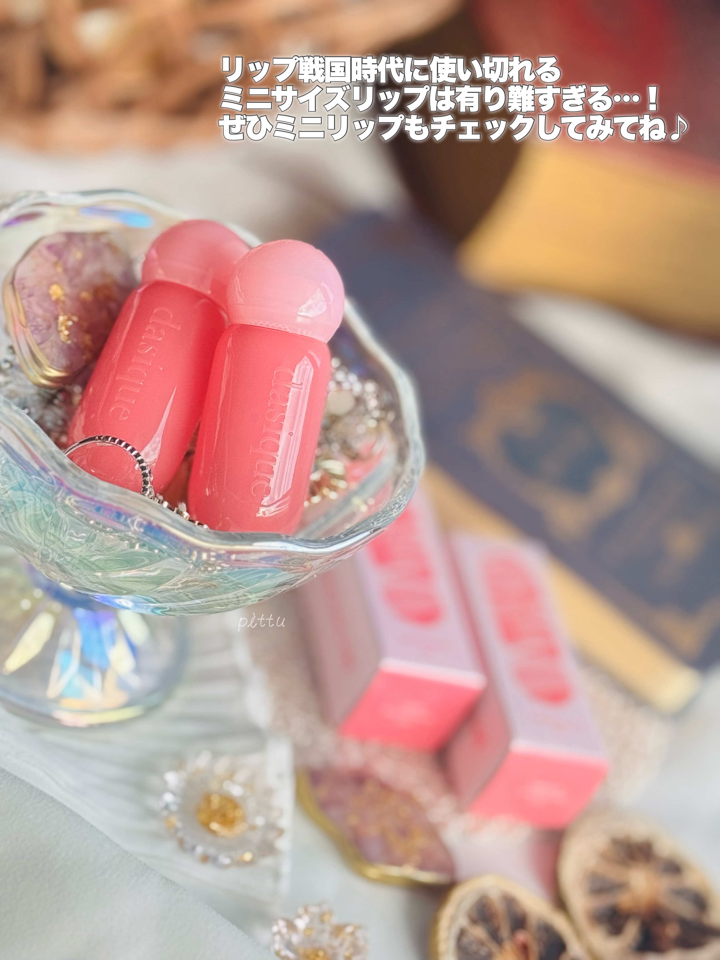 - 【夏新作2カラー登場!】 まるで果実のしずくがそのままリップになったような、みずみずしさと繊細なツヤを詰め込んだ「ジュージーデューイグロウティント」 夏新作で登場する新色「ベリーハート」、「タロミルク」は、透明感とふんわりとした色づきを徹底的にこだわって、何度もテストを重ねて生まれた特別なクールトーンカラー。 ひと塗りで唇をうるおし、重ねても重くならず、果実たっぷり!光をまとうような仕上がりに! - 蜂蜜に漬けた果物のように、うるちゅるふっくらとした果汁粘膜「ジューシーデュイグロウティント」 ミニだけの限定4色 15 ローストロベリー 16 ハミングピンク 17 ロージーシナモン 18 モーブディープス ♡唇に触れた途端、ぷるんと色っぽい果汁コーティング 果汁コーティングがじゅわっと唇に広がり、透明に輝くうるちゅる感を!蜂蜜に漬けた果物のようにぷるんぷるんとした唇を演出するグロウティント ♡イエベ、ブルべに合わせた多彩なカラーバリエーション 14色のカラーバリエーションで単独または、2色レイヤーリングして様々なリップメイクを演出 ♡ティント+リップグロスを一気に塗る効果! ティントの鮮やかな発色とリップグロスのうるうる透明ツヤ感が何度塗り重ねてもべたつかせず、唇にピタッと密着! 2025年11月1日(土)より、Qoo10公式ショップおよび東京フラッグシップストアにて発売予定