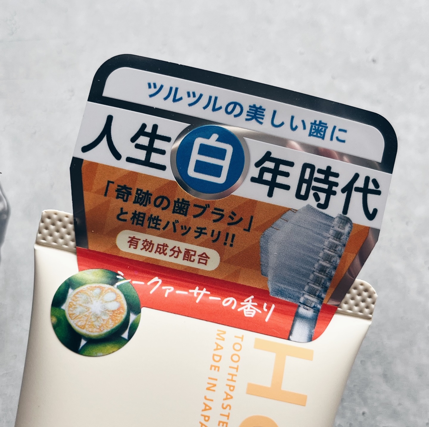 - エイジングケア*発想の薬用ハミガキです。 3つの有効成分(CPC*4、GK2*3、PEG-8*5)が入った医薬部外品で、ホワイトニングと歯周病ケアができます。 ポリリン酸ナトリウム、3 つのアパタイトを配合。 奇跡の歯ブラシとあわせてお使いいただくと、伱間までしっかりホワイトニング*1&歯周病*2ケアに。 ※年齢に合わせたケアのこと 1. 厳選成分で美しい自然な白さへ 薬用成分 PEG-8*5 (着色汚れやタバコのヤニ汚れを除去する)のほか、ポリリン酸ナトリウム・重曹(pH 調整剤として)、3つのアパタイト(サンゴ、卵殻、ホタテ。清掃剤として)を配合 2. 2種の薬用成分が歯周病ケアに 薬用成分 CPC*4 (歯周病を予防する)/ 薬用成分 GK2*3 (歯茎の炎症を抑える) 3. 毎日使いものだからこそ 口に優しい成分を配合 ・5つのフリー処方 長期的な健康を意識して、口内への刺激が少ない成分を処方しています。 研磨剤フリー、パラベンフリー、アルコールフリー、フッ素フリー、ラウリル酸 Na フリー ・10種の植物エキス配合 シャクヤクエキス、セイヨウハッカエキス、ローズマリーエキス、ホップエキス、オドギリソウエキス、カモミラエキス、トウキンセンカエキス、ドクダミエキス、アロエエキス、ハマメリスエキス 4. 歯磨きの時間が楽しくなる心地よい使用感 きめ細やかでクリーミーな泡立ちがブラッシング効果を高めます。 2つのフレーバー ・シトラスミント(フルーティなシークァーサーの香り) フレッシュな甘みが心地よい歯磨き時間を作り出します。さわやかな磨き上がりが好きな方へ ・ライトミント(フレッシュなミントの香り) 爽やかなクール感でお口全体が引き締まります。すっきりとした磨き上がりが好きな方へ ※1 ブラッシングとの併用効果で ※2 歯周炎・歯肉炎などの総称 ※3 グリチルリチン酸ジカリウム ※4 塩化セチルピリジニウム ※5 ポリエチレングリコール 400 ※6 調査方法:製造販売納品請求書合計 調査期間:2009 年 1 月~2023 年 1 月 <効果効能> 歯周炎(歯槽膿漏)の予防、歯肉(齦)炎の予防、むし歯の発生及び進行の予防、口臭の防止、タバコのやに除去、歯を白くする、口中を浄化する、口中を爽快にする