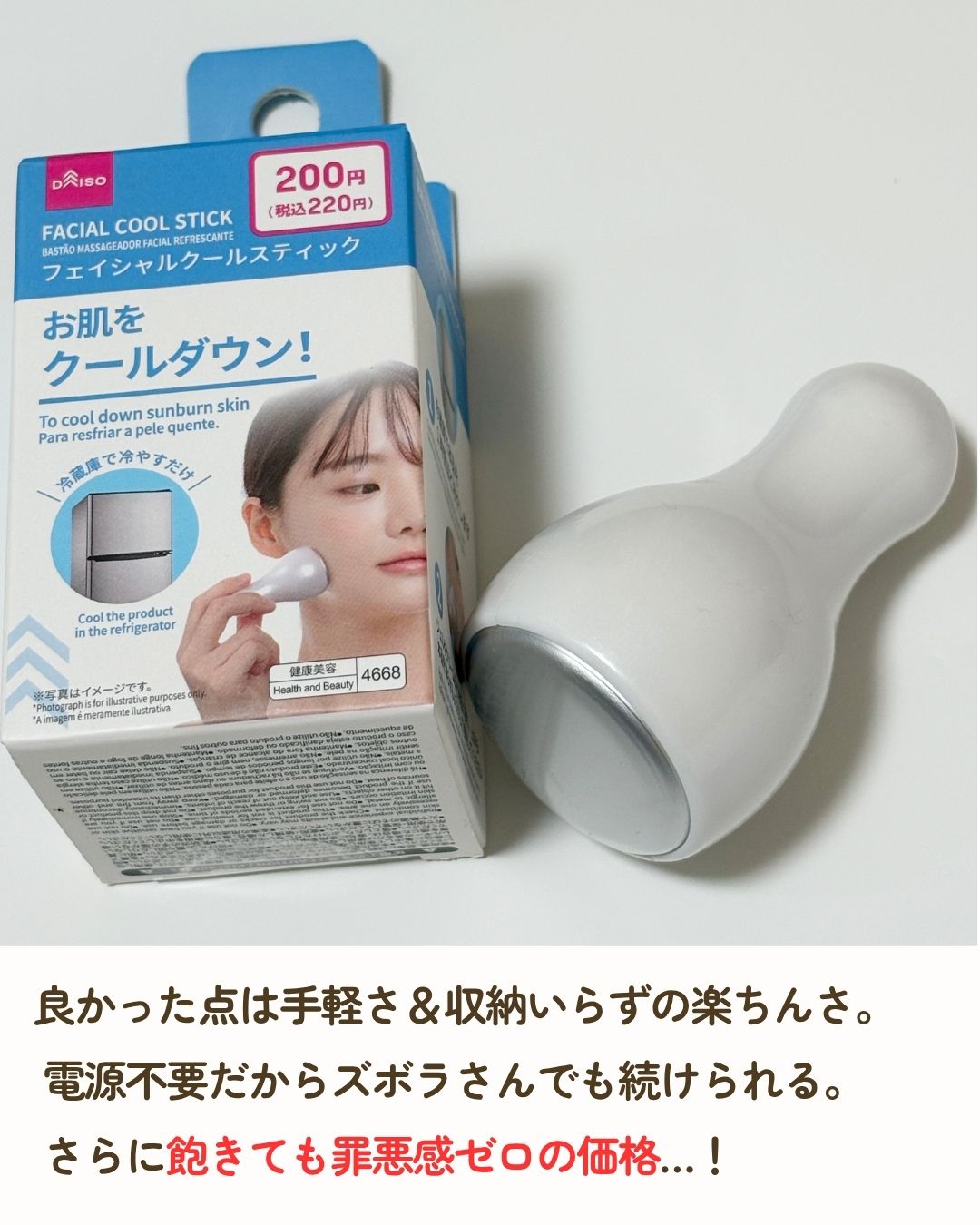 \お肌ひんやりアイテム🧊/▶︎ダイソー フェイシャルクールスティック 税込220円冷蔵庫で冷やしておくとプレート部分が冷たくなりお肌の温度をクールダウンしてくれるアイテム💡メイク前やお風呂上がり、顔が浮腫んでいるときに使用するとひんやりしてと...