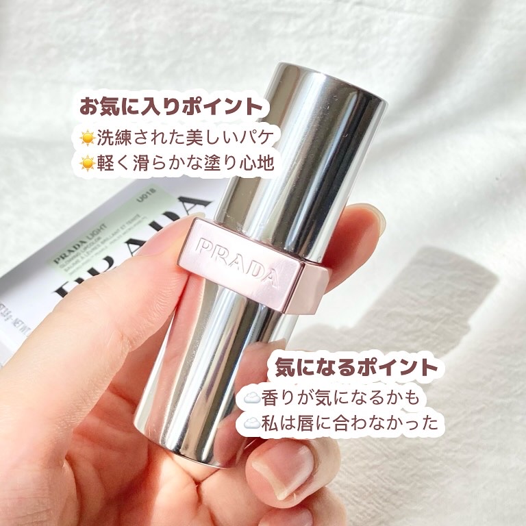 これ、バームなの!?って思うくらい、するする塗れて透け感のあるちゅるんとした唇に。気持ちいい!正直、PRADAリップって発色強そうなイメージがあって、これまで試したことがなかったんだけど…こちらは好き!!ってなった。塗り心地、シアーな発色、パ...
