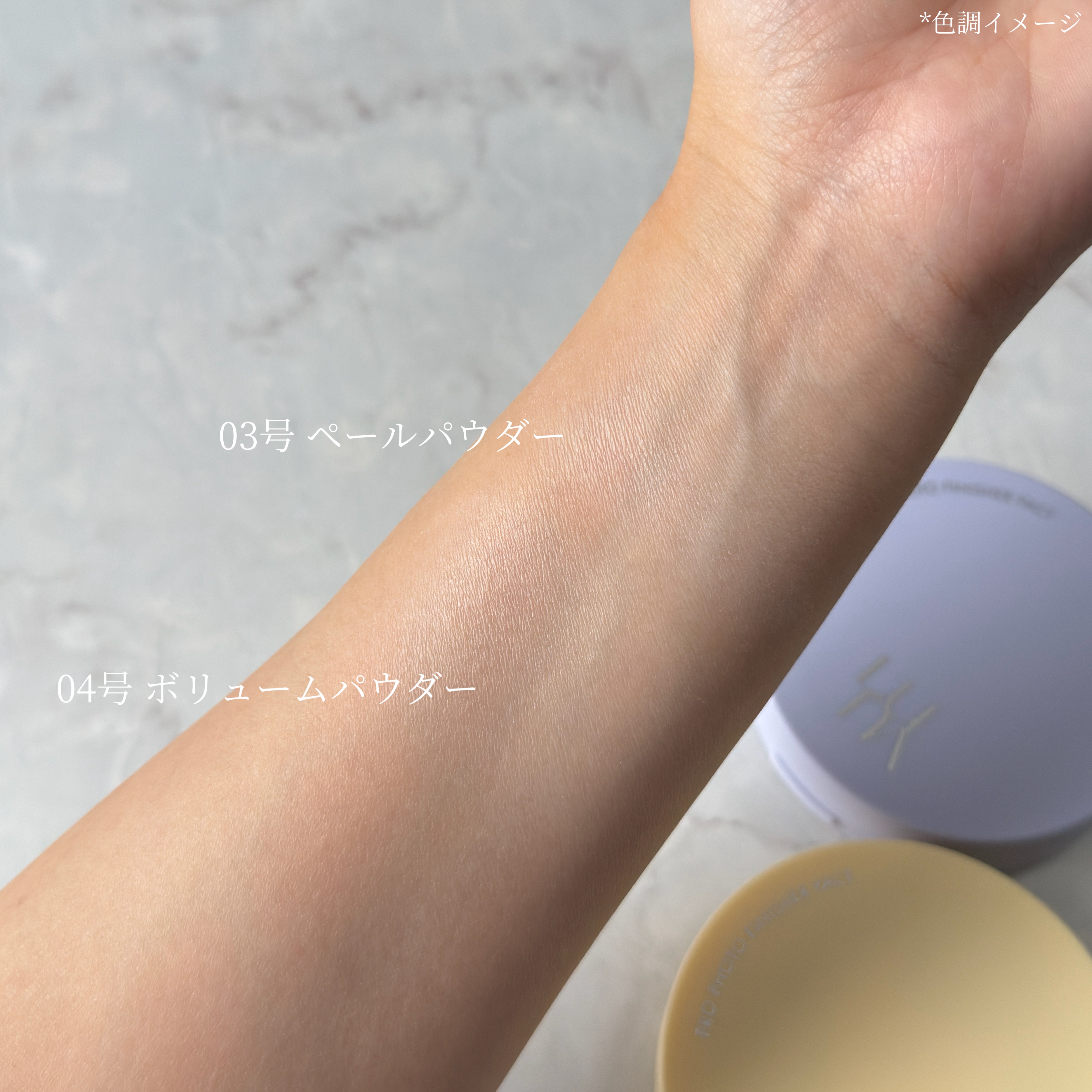 - <01 クリーンパウダー> タルク、ポリメチルシルセスキオキサン、ジフェニルシロキシフェニルトリメチコン、ナイロン-12、合成ミツロウ、ミリスチン酸Mg、(ジメチコン/ビニルジメチコン)クロスポリマー、カプリリルグリコール、エチルヘキシルグリセリン、ジメチコン、シリカ、トリエトキシカプリリルシラン、トコフェロール、酸化鉄 <02ブラーパウダー> マイカ(CI 77019)、タルク、エチルヘキシルメトキシシンナメート、ナイロン-12、シリカ、二酸化チタン(CI 77891)、エチレン/アクリル酸共重合体、酸化亜鉛(CI 77947)、メチレンビス-ベンゾトリアゾリルテトラメチルブチルフェノール、ミリスチン酸マグネシウム、ジメチコン/ビニルジメチコンクロスポリマー、フェニルトリメチコン、トリメチロールプロパントリエチルヘキサノエート、水酸化アルミニウム、ジメチコン、カプリリルグリコール、エチルヘキシルグリセリン、ヒドロゲネチドレシチン、ジメチコン/メチコン共重合体、メチコン、トリエトキシカプリリルシラン、ウルトラマリン(CI 77007)、黄色酸化鉄(CI 77492)、赤色酸化鉄(CI 77491)、シトロネロール、リナロール