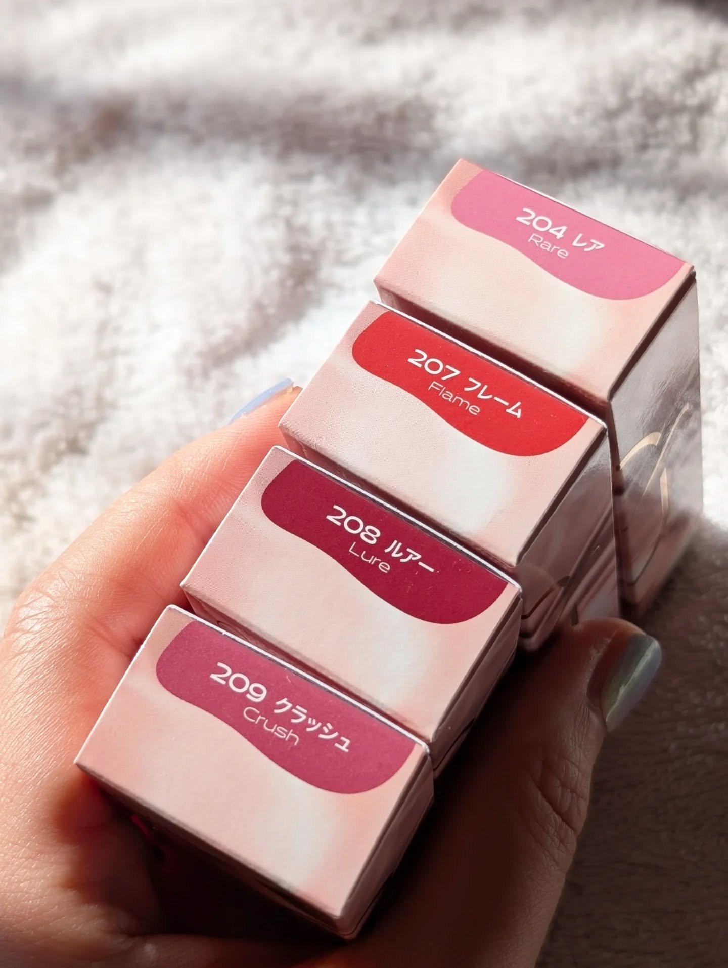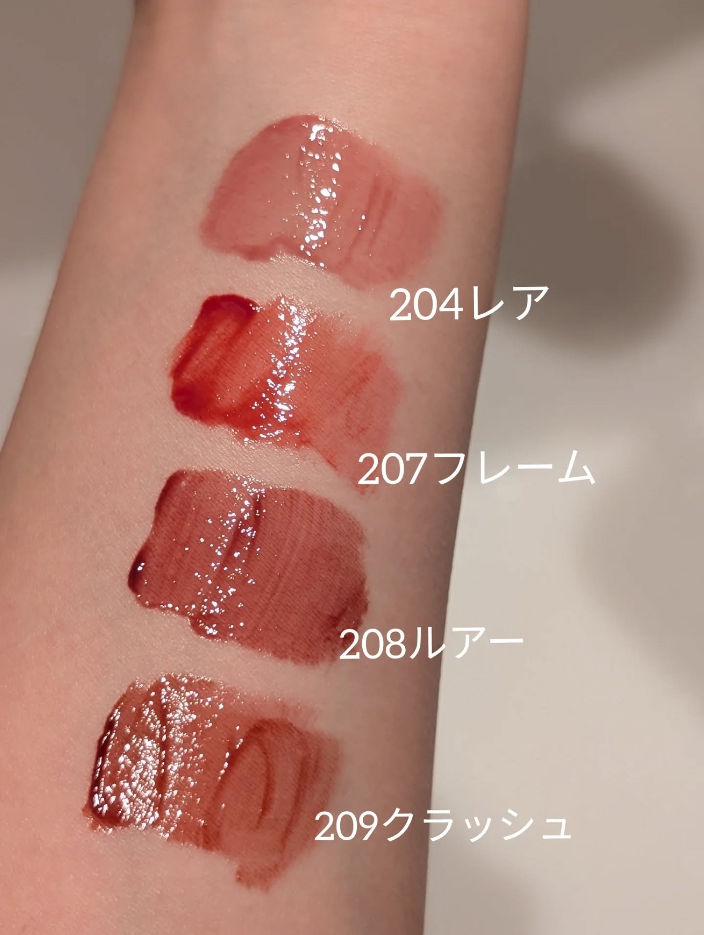 - <201 フェアリー> ダイマージリノール酸ジイソステアリル、ジフェニルシロキシフェニルトリメチコン、ビスジグリセリルポリアシルアジペート-2、水、ジフェニルジメチコン、水添ポリイソブテン、セチルPEG/PPG-10/1ジメチコン、ポリソルベート60、ペンチレングリコール、グリセリン、イソステアリン酸ポリグリセリル-4、フェノキシエタノール、1,2-ヘキサンジオール、セテアレス-20、酸化チタン (CI 77891)、(アクリル酸ヒドロキシエチル/アクリロイルジメチルタウリンNa)コポリマー、ステビオシド、スクワラン、香料、ジラウラミドグルタミドリシンNa、エチルヘキシルグリセリン、エチレンジアミンジコハク酸3Na、赤色227号 (CI 17200)、水酸化Al、黄色5号 (CI 15985)、ポリアクリル酸アンモニウム、イソステアリン酸ソルビタン、黄色4号 (CI 19140)、BG、赤色223号 (CI 45410)、青色1号 (CI 42090)、アラントイン、パンテノール、ツボクサエキス、ヒアルロン酸、加水分解ヒアルロン酸、ヒアルロン酸Na <203 バブリー> ダイマージリノール酸ジイソステアリル、ジフェニルシロキシフェニルトリメチコン、ビスジグリセリルポリアシルアジペート-2、水、ジフェニルジメチコン、水添ポリイソブテン、セチルPEG/PPG-10/1ジメチコン、ポリソルベート60、ペンチレングリコール、グリセリン、イソステアリン酸ポリグリセリル-4、フェノキシエタノール、1,2-ヘキサンジオール、セテアレス-20、(アクリル酸ヒドロキシエチル/アクリロイルジメチルタウリンNa)コポリマー、ステビオシド、酸化チタン (CI 77891)、スクワラン、香料、ジラウラミドグルタミドリシンNa、エチルヘキシルグリセリン、赤色227号 (CI 17200)、エチレンジアミンジコハク酸3Na、黄色5号 (CI 15985)、イソステアリン酸ソルビタン、水酸化Al、ポリアクリル酸アンモニウム、黄色4号 (CI 19140)、BG、青色1号 (CI 42090)、アラントイン、パンテノール、ツボクサエキス、ヒアルロン酸、加水分解ヒアルロン酸、ヒアルロン酸Na <204 レア> ダイマージリノール酸ジイソステアリル、ジフェニルシロキシフェニルトリメチコン、ビスジグリセリルポリアシルアジペート-2、水、ジフェニルジメチコン、水添ポリイソブテン、セチルPEG/PPG-10/1ジメチコン、ポリソルベート60、ペンチレングリコール、グリセリン、イソステアリン酸ポリグリセリル-4、フェノキシエタノール、1,2-ヘキサンジオール、セテアレス-20、(アクリル酸ヒドロキシエチル/アクリロイルジメチルタウリンNa)コポリマー、酸化チタン (CI 77891)、ステビオシド、スクワラン、香料、ジラウラミドグルタミドリシンNa、エチルヘキシルグリセリン、赤色227号 (CI 17200)、黄色5号 (CI 15985)、エチレンジアミンジコハク酸3Na、イソステアリン酸ソルビタン、水酸化Al、ポリアクリル酸アンモニウム、黄色4号 (CI 19140)、青色1号 (CI 42090)、BG、アラントイン、パンテノール、ツボクサエキス、ヒアルロン酸、加水分解ヒアルロン酸、ヒアルロン酸Na <205 ハニーデュー> ダイマージリノール酸ジイソステアリル、ジフェニルシロキシフェニルトリメチコン、ビスジグリセリルポリアシルアジペート-2、水、ジフェニルジメチコン、水添ポリイソブテン、セチルPEG/PPG-10/1ジメチコン、ポリソルベート60、ペンチレングリコール、グリセリン、イソステアリン酸ポリグリセリル-4、フェノキシエタノール、1,2-ヘキサンジオール、セテアレス-20、(アクリル酸ヒドロキシエチル/アクリロイルジメチルタウリンNa)コポリマー、酸化チタン (CI 77891)、ステビオシド、スクワラン、香料、ジラウラミドグルタミドリシンNa、エチルヘキシルグリセリン、赤色227号 (CI 17200)、黄色5号 (CI 15985)、エチレンジアミンジコハク酸3Na、イソステアリン酸ソルビタン、水酸化Al、ポリアクリル酸アンモニウム、黄色4号 (CI 19140)、青色1号 (CI 42090)、BG、アラントイン、パンテノール、ツボクサエキス、ヒアルロン酸、加水分解ヒアルロン酸、ヒアルロン酸Na <206 トフィー> ダイマージリノール酸ジイソステアリル、ジフェニルシロキシフェニルトリメチコン、ビスジグリセリルポリアシルアジペート-2、水、ジフェニルジメチコン、水添ポリイソブテン、セチルPEG/PPG-10/1ジメチコン、ポリソルベート60、ペンチレングリコール、グリセリン、イソステアリン酸ポリグリセリル-4、フェノキシエタノール、1,2-ヘキサンジオール、セテアレス-20、(アクリル酸ヒドロキシエチル/アクリロイルジメチルタウリンNa)コポリマー、ステビオシド、スクワラン、香料、ジラウラミドグルタミドリシンNa、酸化チタン (CI 77891)、エチルヘキシルグリセリン、黄色5号 (CI 15985)、エチレンジアミンジコハク酸3Na、黄色4号 (CI 19140)、赤色227号 (CI 17200)、イソステアリン酸ソルビタン、赤色223号 (CI 45410)、青色1号 (CI 42090)、水酸化Al、ポリアクリル酸アンモニウム、BG、アラントイン、パンテノール、ツボクサエキス、ヒアルロン酸、加水分解ヒアルロン酸、ヒアルロン酸Na <207 フレイム> ダイマージリノール酸ジイソステアリル、ジフェニルシロ