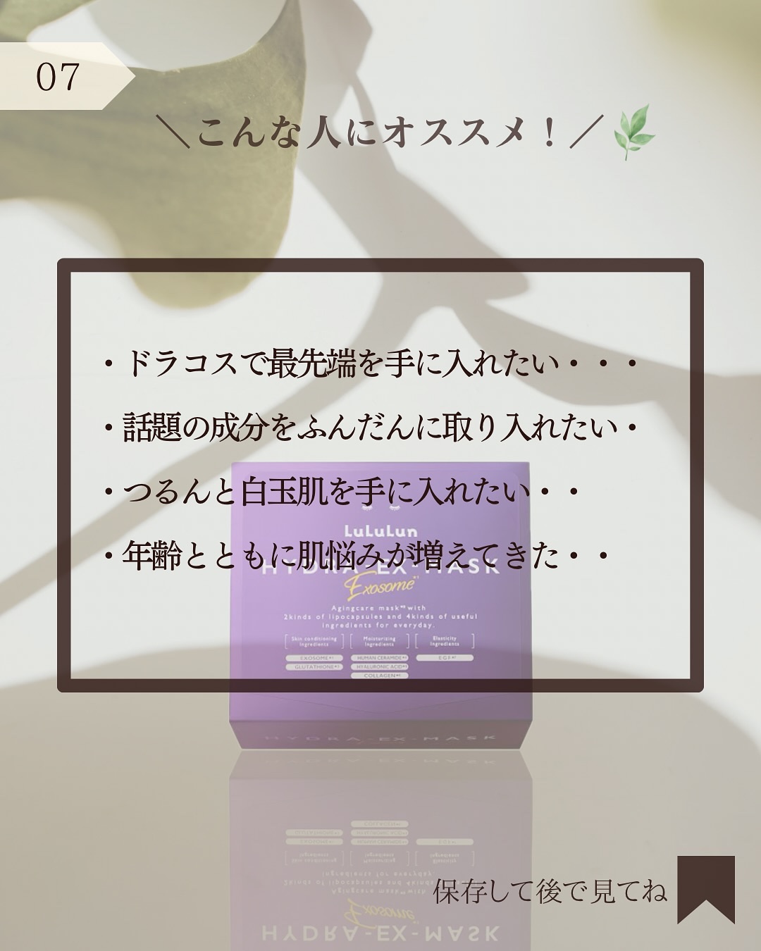 - ルルルンハイドラシリーズから新登場。うるおいにプラスするのは、「エクソソーム*1」。先端再生テクノロジーにインスパイアされた、デイリーエイジングケア※1マスクです。白玉※2グルタチオン*2をプラス配合し、弾力・透明感※3・つやめきのあるなめらかなお肌へ導きます。 (*1 整肌成分 ヒト脂肪由来間葉系細胞エクソソーム *2 整肌成分 グルタチオン、アルブチン、レシチン ※1 年齢に応じて肌へうるおいと弾力を与えるケアのこと ※2 白玉のようなキメが整ったツヤのある肌のこと ※3 うるおいを与えて、乾燥によるくすみを防ぐ)
