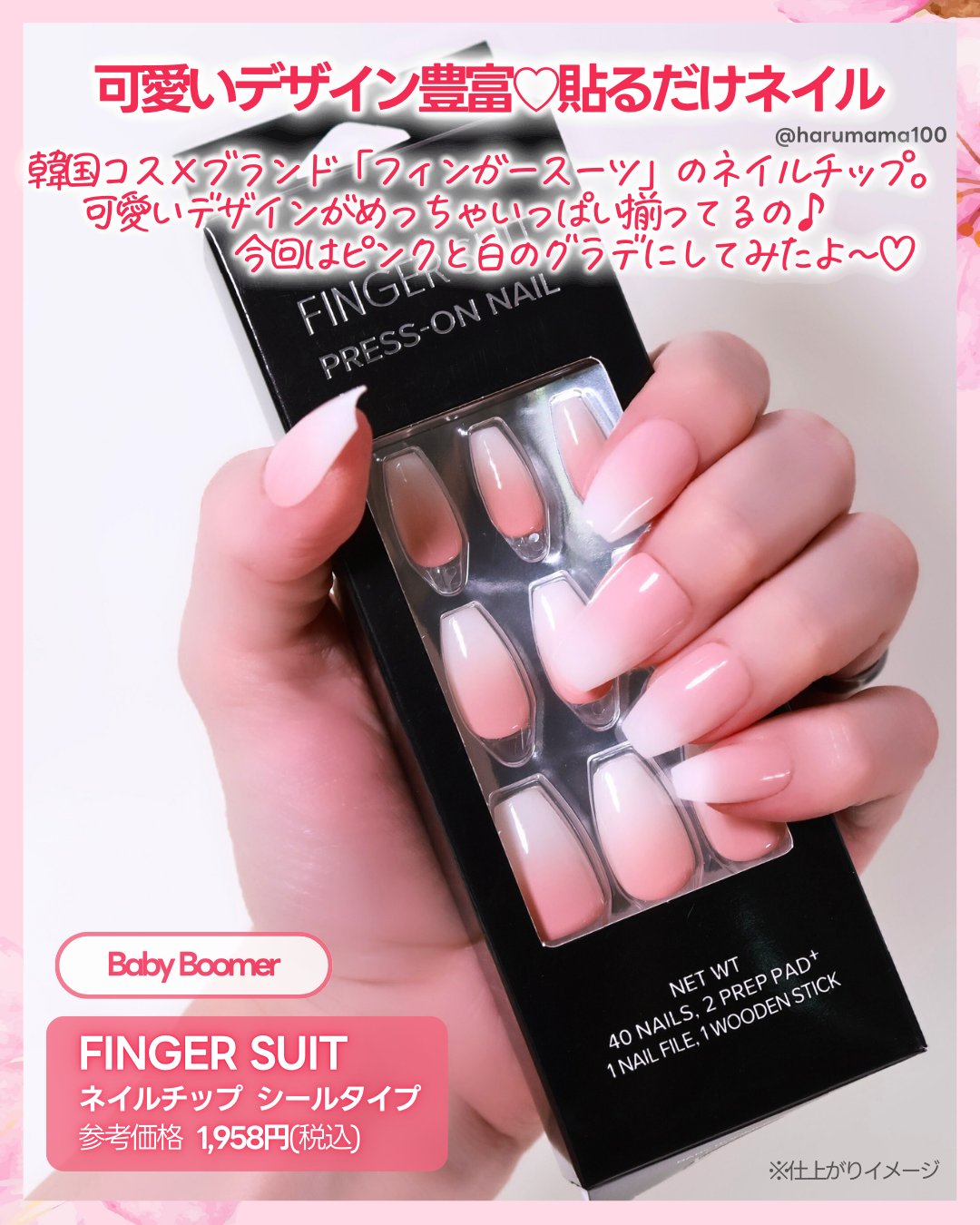 - KPOPアイドルも愛用! トレンディなデザインとハイクオリティで韓国はもちろん日本でも話題になり オンラインだけでなく、ロフト・PLAZA・@COSMEなど全国約1000店舗で販売展開している 韓国発ネイルウェアブランドFINGER SUITの代表商品、「ネイルチップ(シールタイプ)」です。 <FINGER SUITが特別な理由> ① プロのネイリストによるハイクオリティデザイン ② ぷにぷにで自爪のような自然なスリムフィット設計 ③ 接着剤を別当購入する必要なし!タイプ別ALL-IN-ONEキット ④ 16サイズ40ピースでサイズも量も豊富だから2回以上使用可能 ⑤ FINGER SUITならではの独自のネイルシェイプ ⑥ 迅速な国内配送システム 【セット内容】 ● ネイルチップ40ピース ● プレップパッド2枚、ネイルファイル1個、ウッドスティック1本 ● 取扱説明書