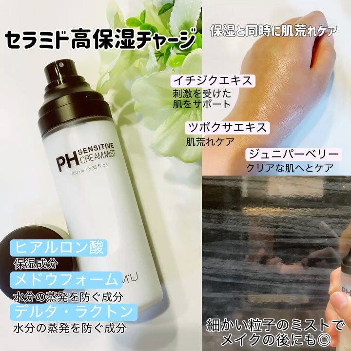 - サミュの大人気商品であるPHセンシティブクリームの成分をそのまま詰め込んで誕生した低刺激高保湿クリームミストです。 細かい霧状のミストがお肌に素早くなじみ、保湿・整肌ケアはもちろんのことお肌につやを与えてくれます。