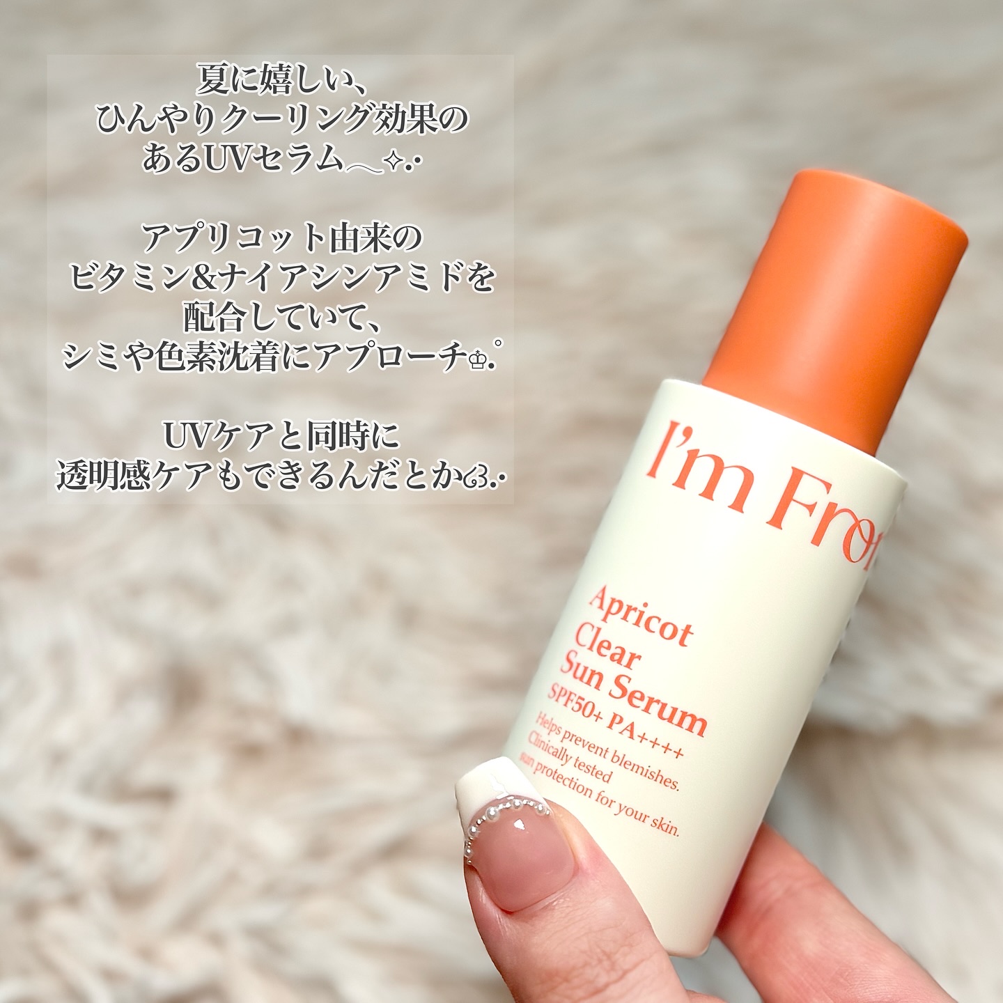 .+゚☆\しっとり&クーリング/▷I'mFrom(@imfrom_jp)アプリコットクリアサンセラム50mlSPF50+PA++++⭐️軽く振ってから使用シミやくすみ*を自然にカバーアプリコットビタミンの力でシミや気になる部分をケアして紫外線...