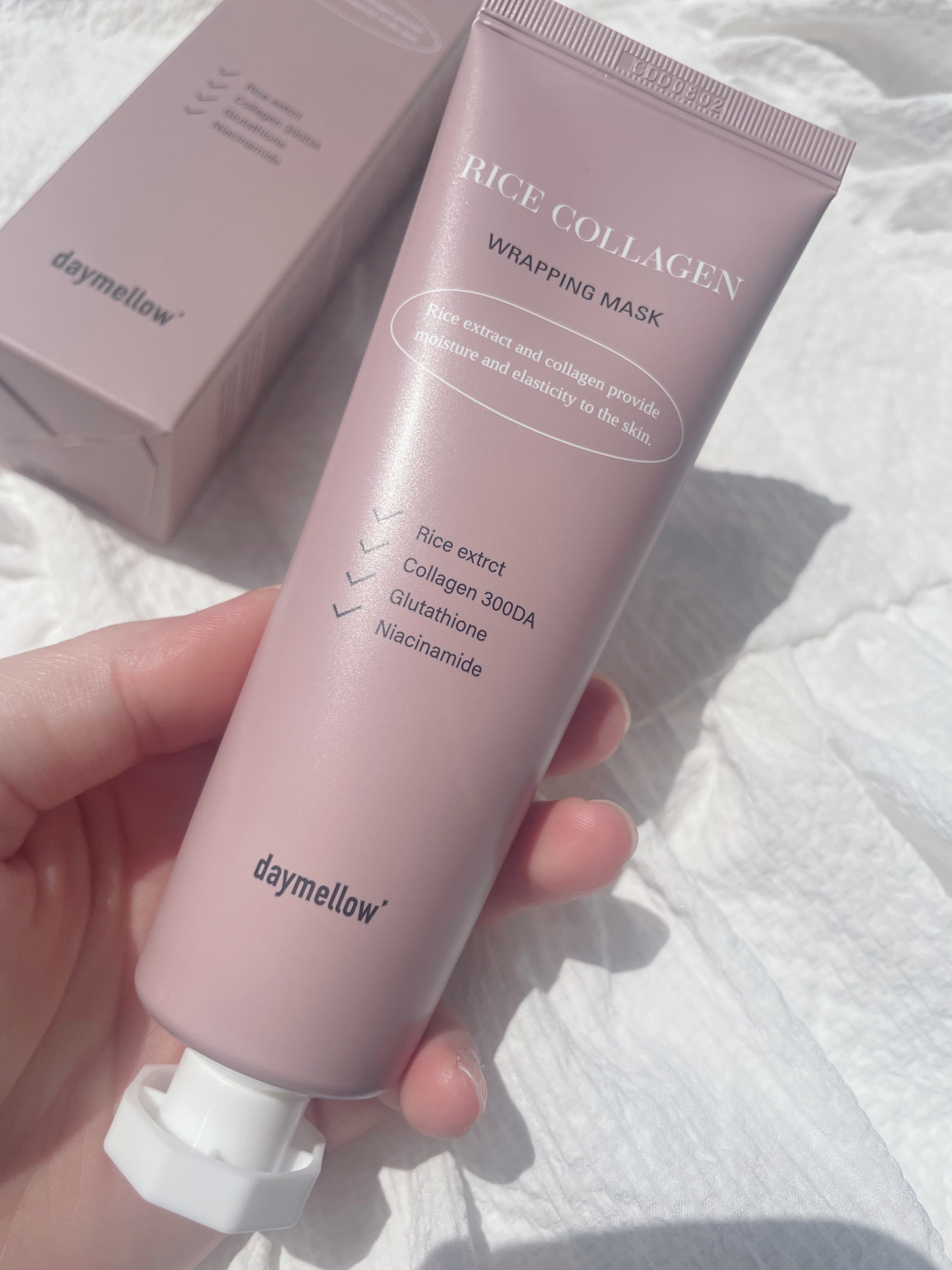 ♡daymellowライスコラーゲンラッピングマスク高濃度米ぬかエキス62%配合のピールオフパックです塗って20分後に剥がしますが毛穴を引き締めツヤのあるもちもちした肌に導いてくれるそうです出したときは白色ですが肌につけると透明になり剥がすと...