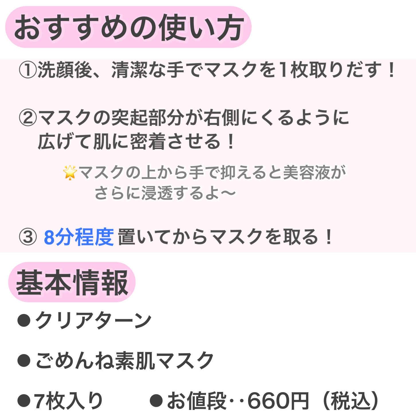 - 【クリアターン ごめんね素肌マスク】 負担をかけて、あれてしまった肌の素肌環境※1をととのえる“速攻集中リペア※2マスク”です。 ① あれがちな肌を素早くコンディションケア! ザクロエキス、桜エキス※3、ウメ果実エキスBG配合し、ゆらぎやすい肌環境をととのえ、肌あれをケアします。また、うるおいケア成分として、ヒアルロン酸、白キクラゲ多糖体BGを配合。外的ストレス※4や不規則な生活の影響を受けやすい肌も健やかでゆらぎにくい肌へみちびきます。 ②敏感肌も使える、弱酸性・低刺激処方 無香料・無着色・無鉱物油・アルコールフリー(エチルアルコール)・パラベンフリー・紫外線吸収剤フリー・シリコーンフリー・パッチテスト済み・アレルギーテスト済み・スティンギングテスト済み・敏感肌自覚者による連用テスト済み(すべての方にアレルギーや皮膚刺激が起きない、刺激感がないというわけではありません。すべての方の肌に合うということではありません。) ③角質ケアもできる!凸凹高密着シート コットン生まれのやわらかな肌触りのベンリーゼを使用。 表面に凸凹のエンボス加工を施しているため、密着性が高く、はがしたマスクでやさしく顔をふきとることで角質ケアもできます。 ※1 うるおい環境のこと ※2 うるおいお手入れのこと ※3 ソメイヨシノ葉エキス、ウメ果実エキスBGはウメ果実エキス・BG(保湿) ※4 乾燥による刺激のこと