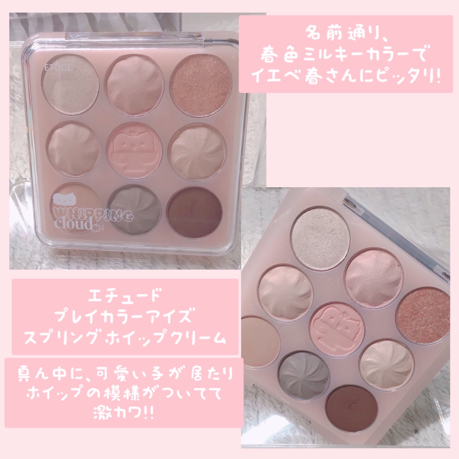 可愛さが滲み出てる!激カワパレット🥺💕ETUDEプレイカラーアイズ ホイッピングクラウドコレクションスプリングホイップクリーム¥2,750名前通りの、春色ミルキーカラーで、期待を裏切らない、使いやすくて超可愛いパレットです!シール付きでカスタ...