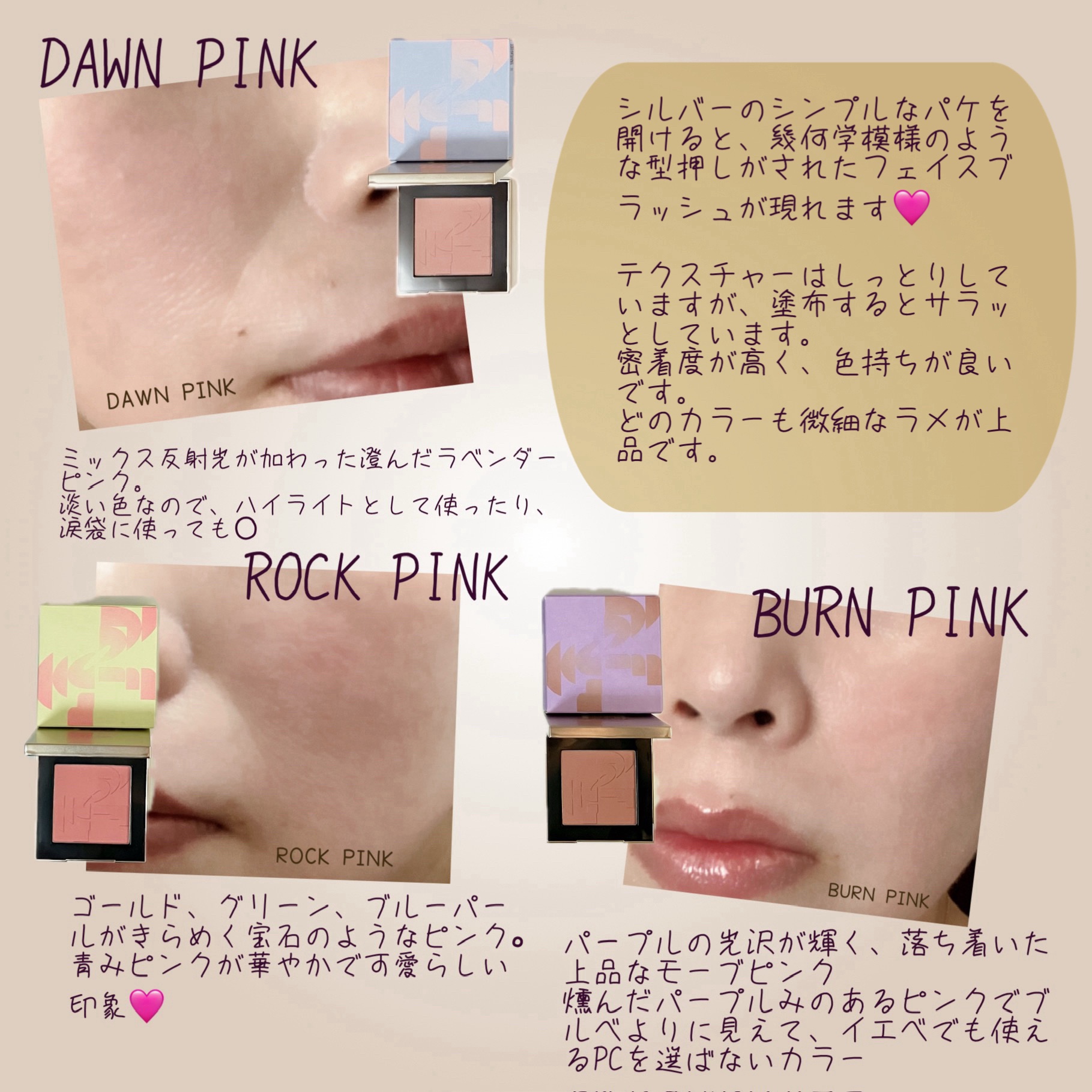 デイリー使いしやすく、ポーチに入れてもかさばらないミニサイズ。 ひと塗りで抜け感・シャレ感が叶うこだわりの色味。 パール入りでハイライト効果もあり、血色感とツヤを足したい時におすすめ! 軽くて嵩張らない事は勿論、ミルクラベンダーのお色が可愛らしく、肌に透明感が出ます。 元々持って行こうと思ったSHEGLAMのチークのマットな感じよりもグロッシーなこちらのチークの方がこれからの季節に合っていると感じました。