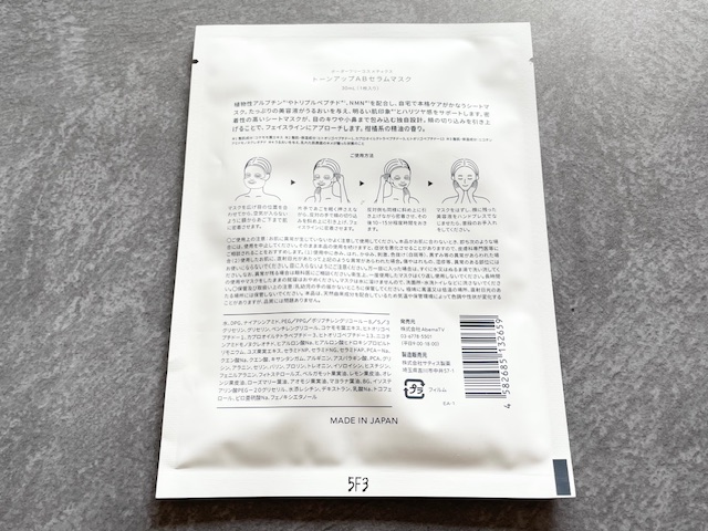 トーンアップABセラムマスクを使ってみました白地にシルバーのデザインのパッケージに入っています。一袋に1枚入っています。植物由来の成分などが入っていますよ。シートがとても工夫されていいるんですよ。密着力と抱水性に優れたシートで、切り込みが細か...