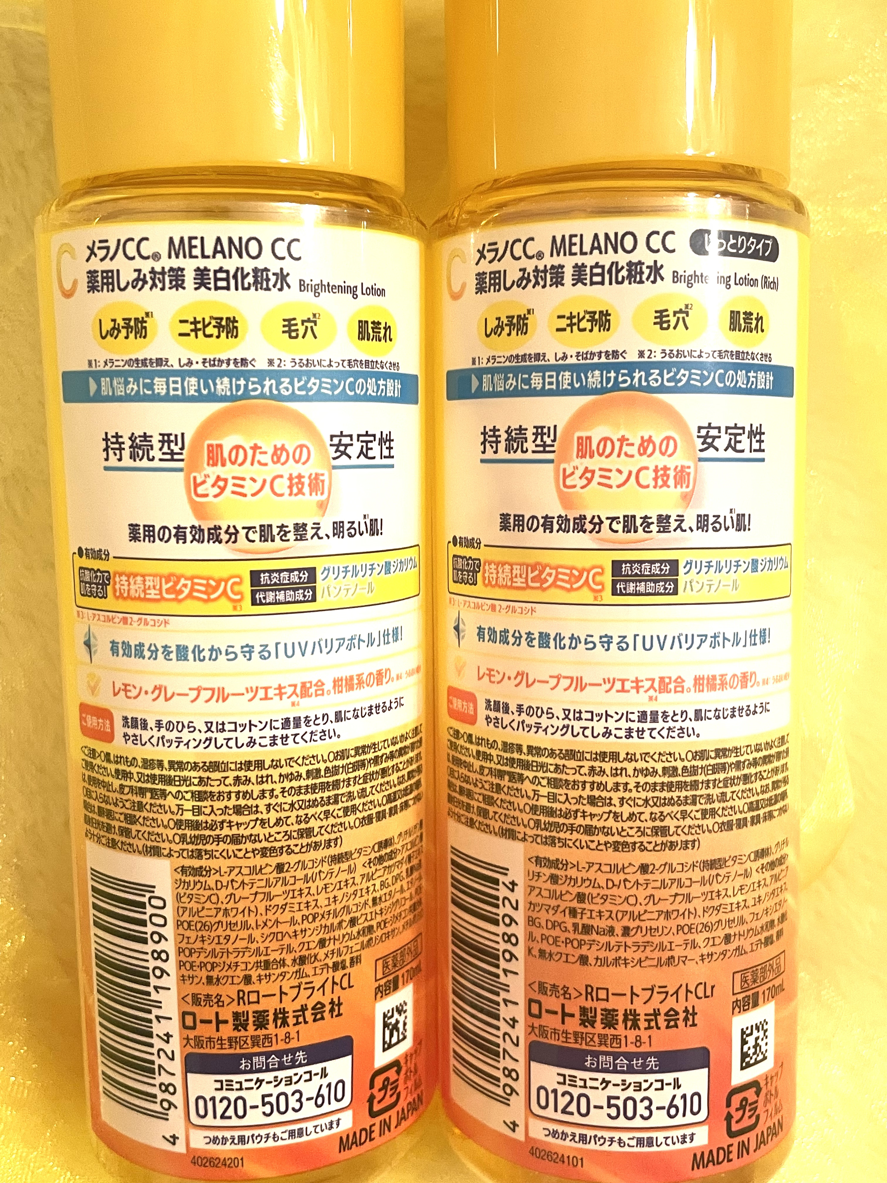 - 「メラノCC 薬用しみ対策 美白化粧水」は、顔全体にうるおいを与えながら、しみ対策できる薬用美白化粧水。 美白有効成分高浸透ビタミンC誘導体*1が角質層すみずみまで浸透し、メラニンの生成を抑え、しみ・そばかすを防ぎ、透明感のある肌へと導きます。 また、抗炎症成分*2と3種のうるおい成分*3を配合。ニキビ痕が気になる肌にもうるおいを与え、肌を整えます。 さわやかな柑橘系の香りです。 *1:3-O-エチルアスコルビン酸 *2:グリチルリチン酸ジカリウム *3:アルピニアホワイト、レモンエキス、グレープフルーツエキス