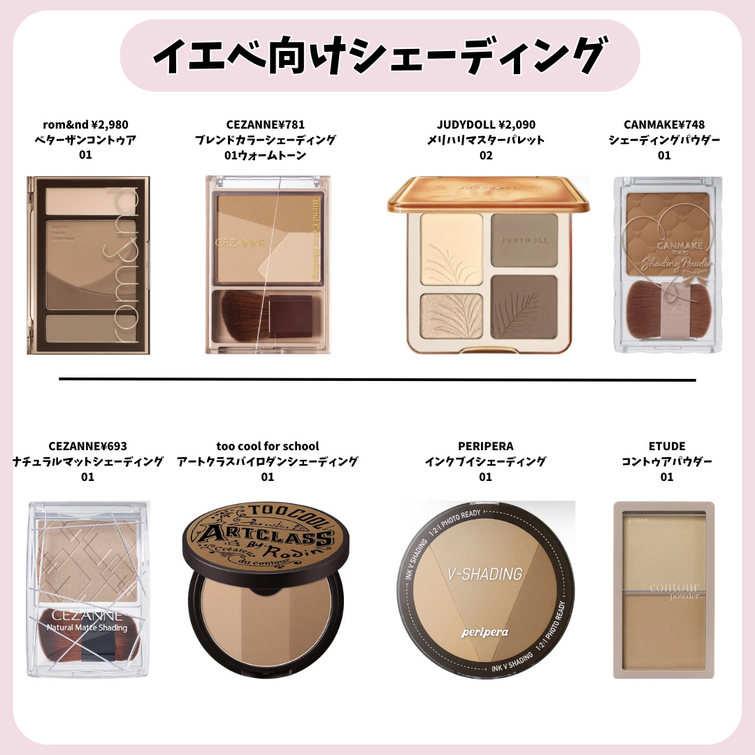キャンメイク シェーディングパウダー 05 ムーングレージュ ¥748 CEZANNE ナチュラルマットシェーディング 02 クールトーン ¥693 rom&nd ベターザンコントゥア グレークール ¥2,980