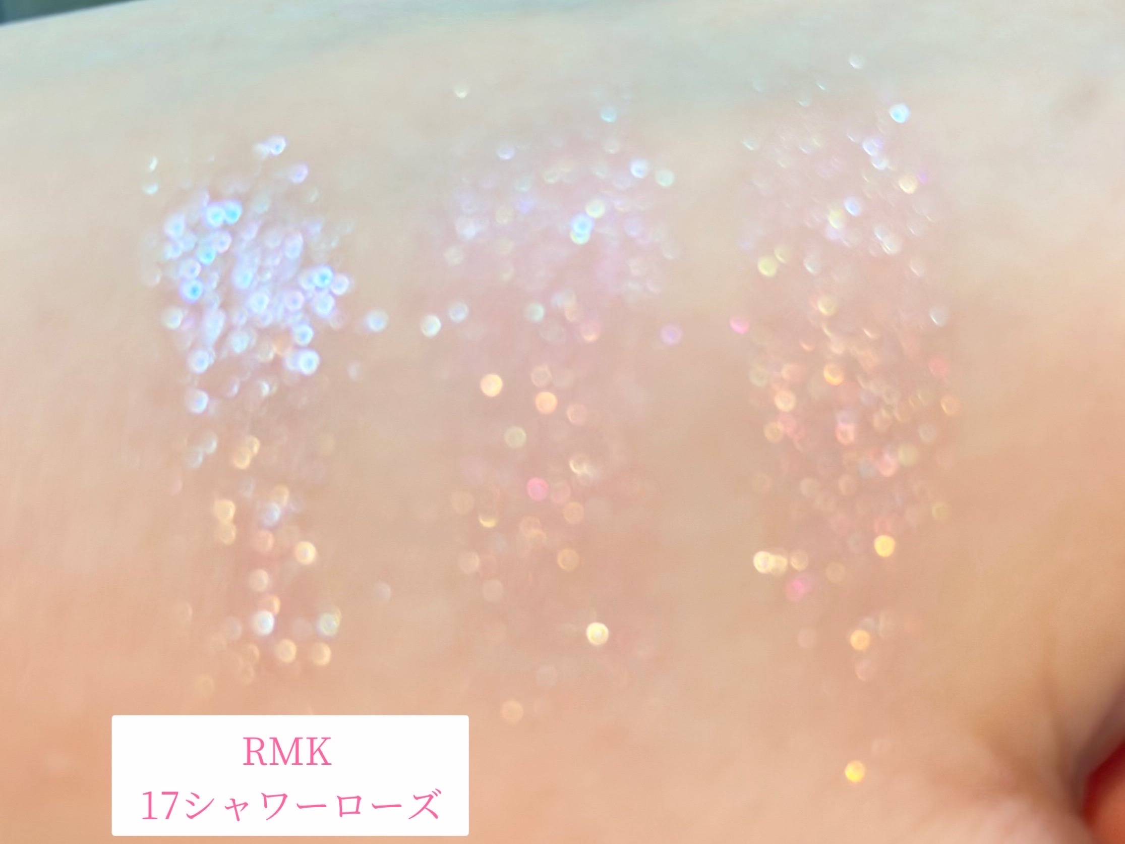 ピンク系ラメアイシャドウ比較💁♀️画像左側から①RMKインフィニシェイドシングルアイシャドウ17シャワーローズ②SUQQUモノルックアイズ L-05澄桜③2aNベターミーアイパレット16バブルキャンディ(下段中央05バブルポップ)輝度✨②<...