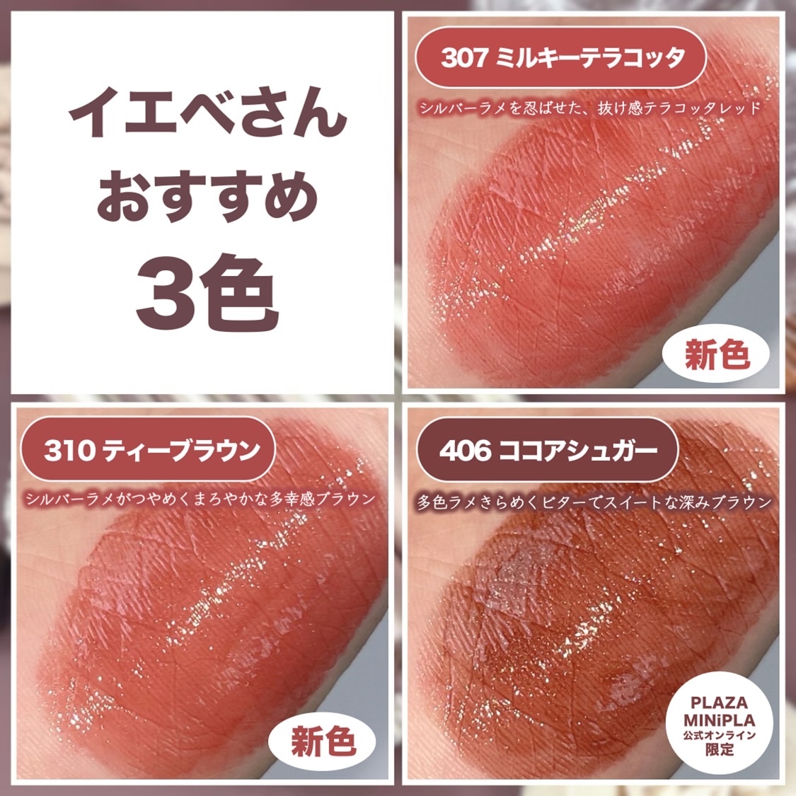 このグラスティングメルティングバームと言えばこのむっちり光沢感のある仕上がり! 重ね塗りをしても厚塗り感が出ず透け感のある仕上がりになるのもいい!! ウォーターホールディングシステムが唇の水分を飛ばさないように高保湿の保護膜を形成するため、時間が経っても水分感溢れる仕上がりが持続するよ😊 唇に当てると体温でじわっととろけてなめらかな塗り心地でまるでキャンディみたいなツヤ感のある唇に仕上がる♡ 今回の新色はグレーがひとさじ加わったようなナチュラルなヌーディーカラーが全6色展開になってます! これで既存のカラーと合わせると全部で15色展開になりました✨ めっちゃカラバリ豊富!!