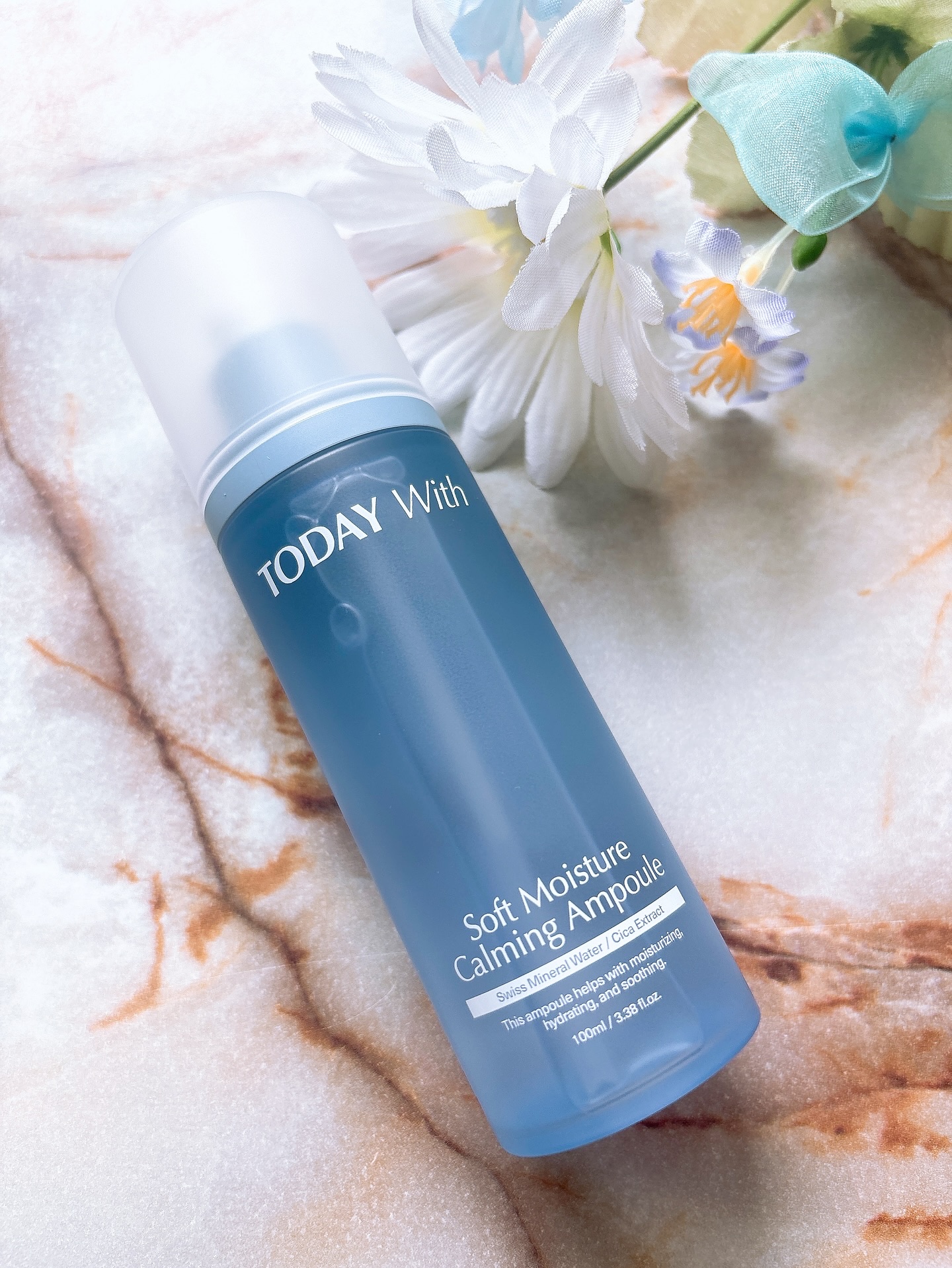 トゥデイウィズソフトモイスチャーカーミングアンプルを使ってみました。水色の爽やかなボトルに入っています。透明のフタを外すとポンプ式の容器になっていますよ。出しやすいです。透明で少しとろみがあるテクスチャーです。伸びは良くてしっとりします。鎮静...