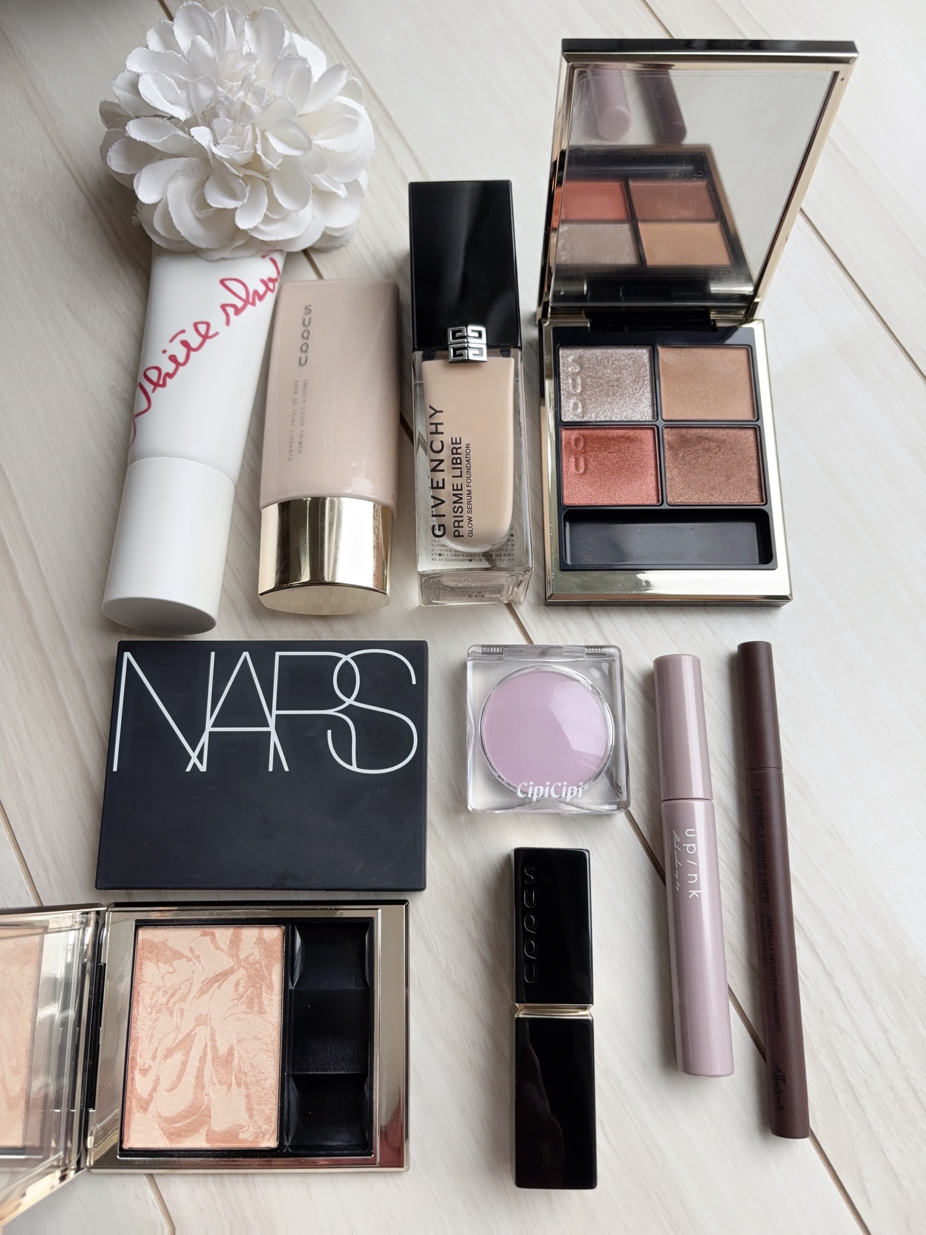 パキッとしたピンクが目立たないようにベージュをアイホールに入れてから少しずつ重ねてみました🫶🏻 最後に左上のピンクラメを足すと一気に明るくなったよ😲 やっぱり涼苺が好きで週1くらいで実は使ってるので年内に底見えしないかな〜と期待🥳
