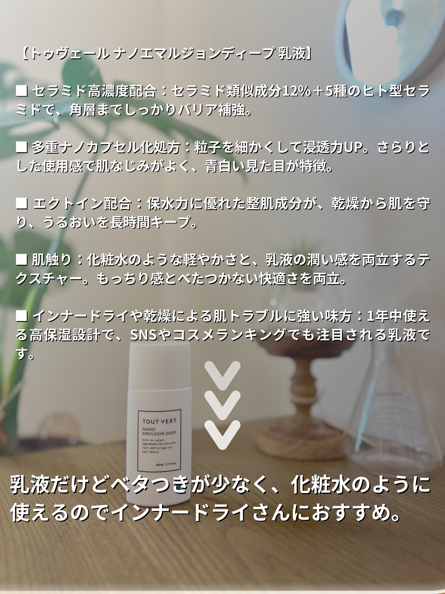 この乳液凄いんです!! まず感動するのが、使用感です。 さらさら水っぽいのに馴染ませるとしっとりもちもちして不思議なんです🤧 成分も素晴らしくて、セラミド類似成分12%・ヒト型セラミド5種・保水力に優れたエクトインが配合されているんです🫢 インナードライさんや乾燥肌さんに特におすすめしたいです!