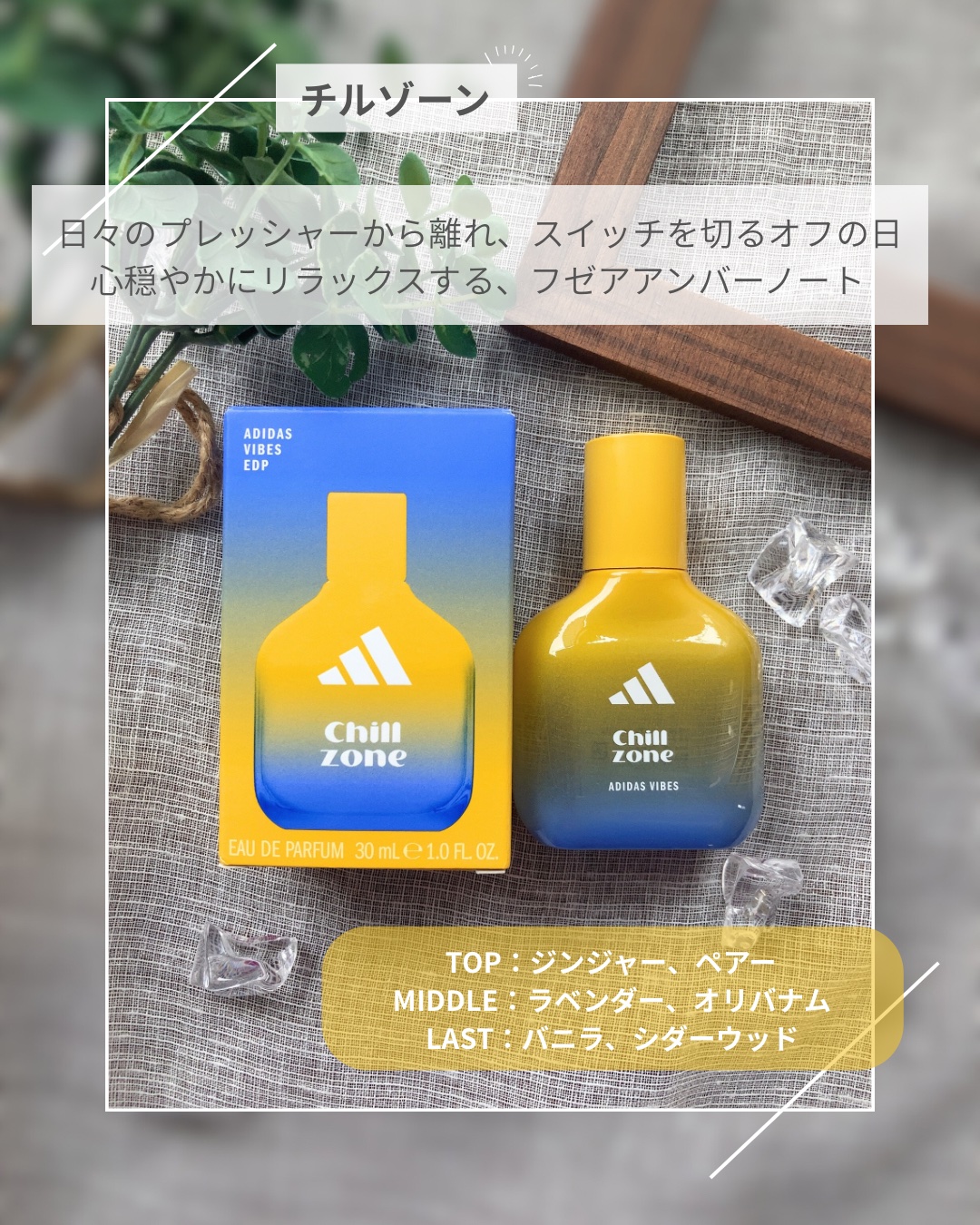 ♡adidasVibesChillZone心をふわっとリラックスさせてくれるユニセックスフレグランス🌿✨最初はジンジャーと洋ナシの爽やかな香りから始まり、やがてラベンダーとオリバナムがやさしく包み込みます︎︎☁最後はバニラとシダーウッド🌲🍨の...
