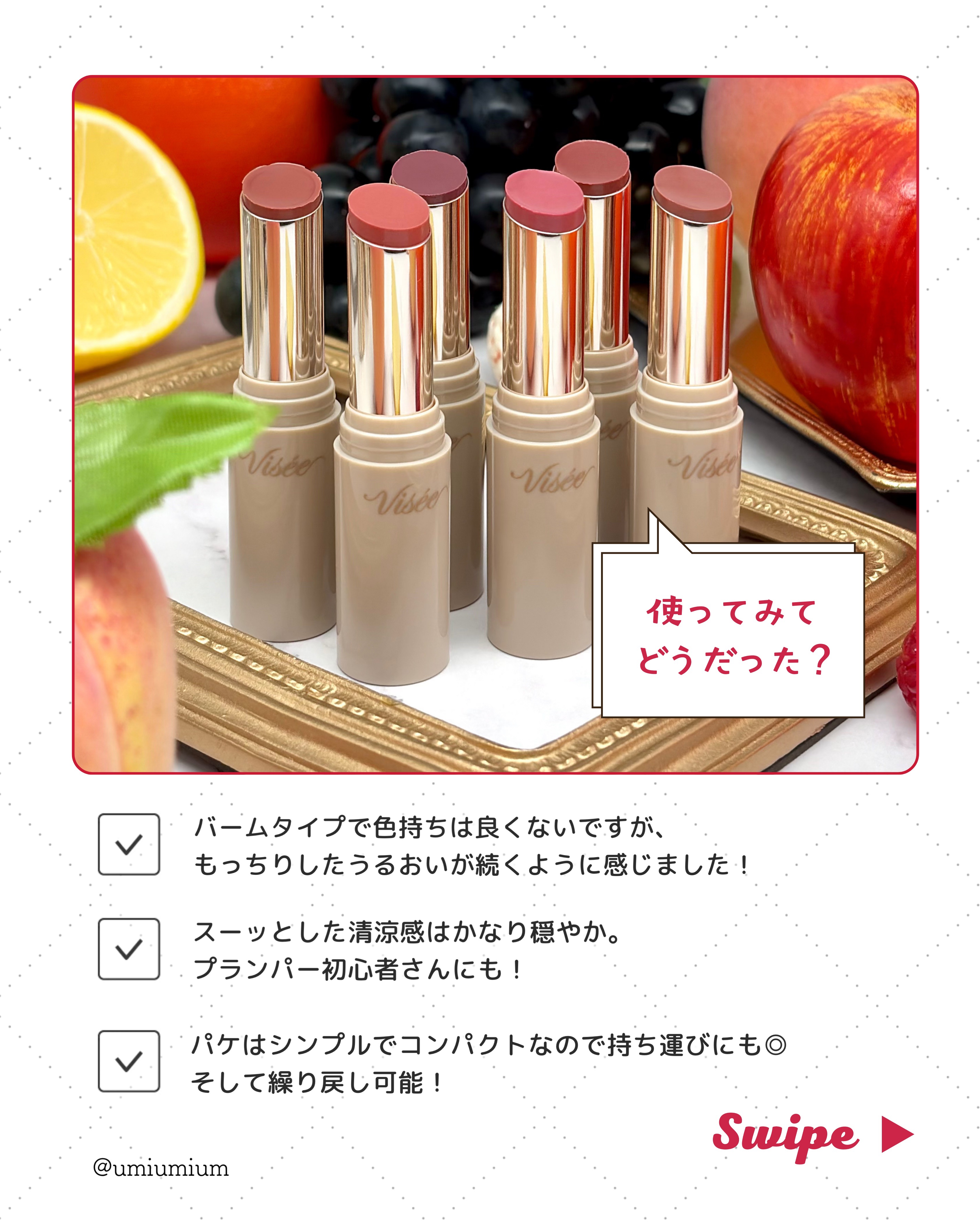 | 口紅・グロス・リップライナーランキング第104位 | 体温でとろけるちゅるん質感なのに、 バーム特有のベタつきが控えめで ムラになりにくいところがお気に入り! | 詳細を見る | |