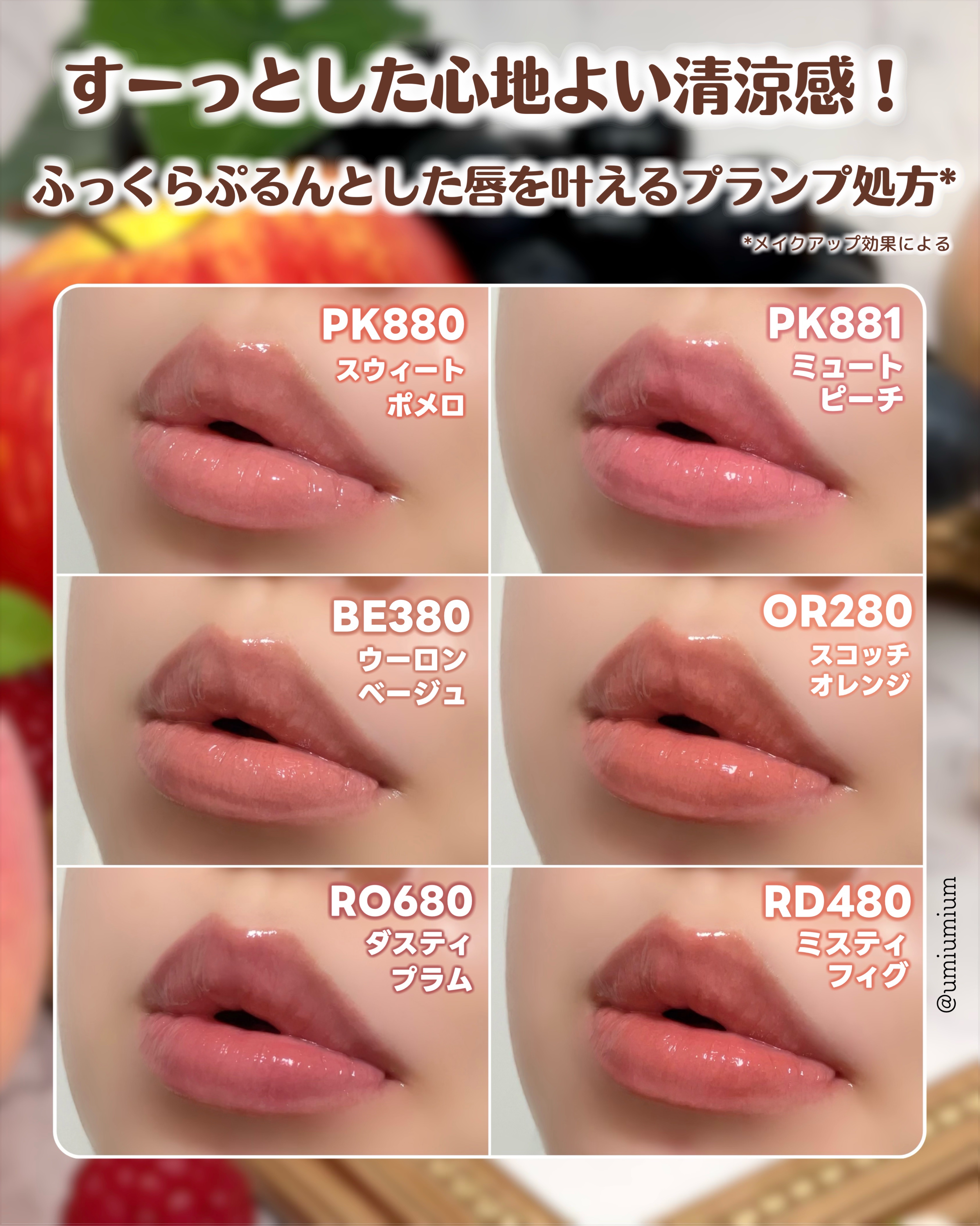 - <BE380 ウーロンベージュ> ダイマージリノール酸ダイマージリノレイルビス(ベヘニル/イソステアリル/フィトステリル)、リンゴ酸ジイソステアリル、ビスジグリセリルポリアシルアジペート-2、デカイソステアリン酸ポリグリセリル-10、トリイソステアリン酸ポリグリセリル-2、ジイソステアリン酸ポリグリセリル-3、ポリブテン、トリメリト酸トリトリデシル、ダイマージリノール酸ジオクチルドデシル、パラフィン、マイクロクリスタリンワックス、トコフェロール、モモ花エキス、BG、(エチレン/プロピレン)コポリマー、(セバシン酸/イソパルミチン酸)ジグリセリル、オクチルドデカノール、カプリル酸グリセリル、ジイソステアリン酸ポリグリセリル-2、ジステアルジモニウムヘクトライト、スクワラン、プロパンジオール、メントール、メントキシプロパンジオール、合成ワックス、水、炭酸プロピレン、香料、酸化チタン、酸化鉄、黄4、赤202 <OR280 スコッチオレンジ> ダイマージリノール酸ダイマージリノレイルビス(ベヘニル/イソステアリル/フィトステリル)、リンゴ酸ジイソステアリル、ビスジグリセリルポリアシルアジペート-2、デカイソステアリン酸ポリグリセリル-10、トリイソステアリン酸ポリグリセリル-2、ジイソステアリン酸ポリグリセリル-3、ポリブテン、トリメリト酸トリトリデシル、ダイマージリノール酸ジオクチルドデシル、パラフィン、マイクロクリスタリンワックス、トコフェロール、モモ花エキス、BG、(エチレン/プロピレン)コポリマー、(セバシン酸/イソパルミチン酸)ジグリセリル、オクチルドデカノール、カプリル酸グリセリル、ジイソステアリン酸ポリグリセリル-2、ジステアルジモニウムヘクトライト、スクワラン、プロパンジオール、メントール、メントキシプロパンジオール、合成ワックス、水、炭酸プロピレン、香料、酸化チタン、酸化鉄、赤202 <PK880 スウィートポメロ> ダイマージリノール酸ダイマージリノレイルビス(ベヘニル/イソステアリル/フィトステリル)、リンゴ酸ジイソステアリル、ビスジグリセリルポリアシルアジペート-2、デカイソステアリン酸ポリグリセリル-10、トリイソステアリン酸ポリグリセリル-2、ジイソステアリン酸ポリグリセリル-3、ポリブテン、トリメリト酸トリトリデシル、ダイマージリノール酸ジオクチルドデシル、パラフィン、マイクロクリスタリンワックス、トコフェロール、モモ花エキス、BG、(エチレン/プロピレン)コポリマー、(セバシン酸/イソパルミチン酸)ジグリセリル、オクチルドデカノール、カプリル酸グリセリル、ジイソステアリン酸ポリグリセリル-2、ジステアルジモニウムヘクトライト、スクワラン、プロパンジオール、メントール、メントキシプロパンジオール、合成ワックス、水、炭酸プロピレン、香料、酸化チタン、酸化鉄、黄4、赤202 <PK881 ミュートピーチ> ダイマージリノール酸ダイマージリノレイルビス(ベヘニル/イソステアリル/フィトステリル)、リンゴ酸ジイソステアリル、ビスジグリセリルポリアシルアジペート-2、デカイソステアリン酸ポリグリセリル-10、トリイソステアリン酸ポリグリセリル-2、ジイソステアリン酸ポリグリセリル-3、ポリブテン、トリメリト酸トリトリデシル、ダイマージリノール酸ジオクチルドデシル、パラフィン、マイクロクリスタリンワックス、トコフェロール、モモ花エキス、BG、(エチレン/プロピレン)コポリマー、(セバシン酸/イソパルミチン酸)ジグリセリル、オクチルドデカノール、カプリル酸グリセリル、ジイソステアリン酸ポリグリセリル-2、ジステアルジモニウムヘクトライト、スクワラン、プロパンジオール、メントール、メントキシプロパンジオール、合成ワックス、水、炭酸プロピレン、香料、酸化チタン、酸化鉄、黄4、赤202 <RD480 ミスティフィグ> ダイマージリノール酸ダイマージリノレイルビス(ベヘニル/イソステアリル/フィトステリル)、リンゴ酸ジイソステアリル、ビスジグリセリルポリアシルアジペート-2、デカイソステアリン酸ポリグリセリル-10、トリイソステアリン酸ポリグリセリル-2、ジイソステアリン酸ポリグリセリル-3、ポリブテン、トリメリト酸トリトリデシル、ダイマージリノール酸ジオクチルドデシル、パラフィン、マイクロクリスタリンワックス、トコフェロール、モモ花エキス、BG、(エチレン/プロピレン)コポリマー、(セバシン酸/イソパルミチン酸)ジグリセリル、オクチルドデカノール、カプリル酸グリセリル、ジイソステアリン酸ポリグリセリル-2、ジステアルジモニウムヘクトライト、スクワラン、プロパンジオール、メントール、メントキシプロパンジオール、合成ワックス、水、炭酸プロピレン、香料、酸化チタン、酸化鉄、赤202 <RO680 ダスティプラム> ダイマージリノール酸ダイマージリノレイルビス(ベヘニル/イソステアリル/フィトステリル)、リンゴ酸ジイソステアリル、ビスジグリセリルポリアシルアジペート-2、デカイソステアリン