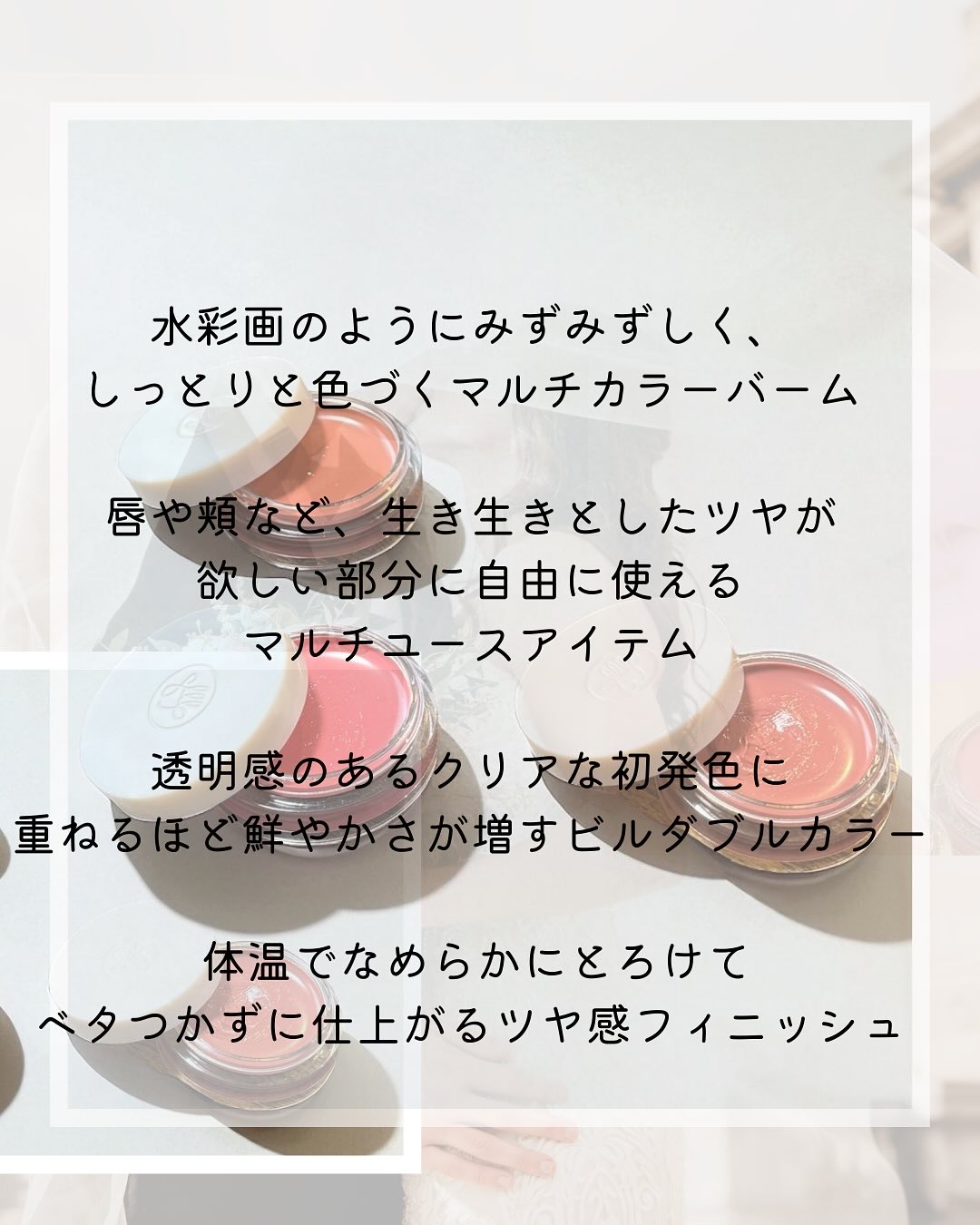 - 唇や頬など、生き生きとした輝きが必要なところ、どこにでも澄んで潤いを与えるマルチユースのグロスバームです。体温でやさしく溶けて潤いを与え、ベタつきなしで仕上げる光沢フィニッシュです。