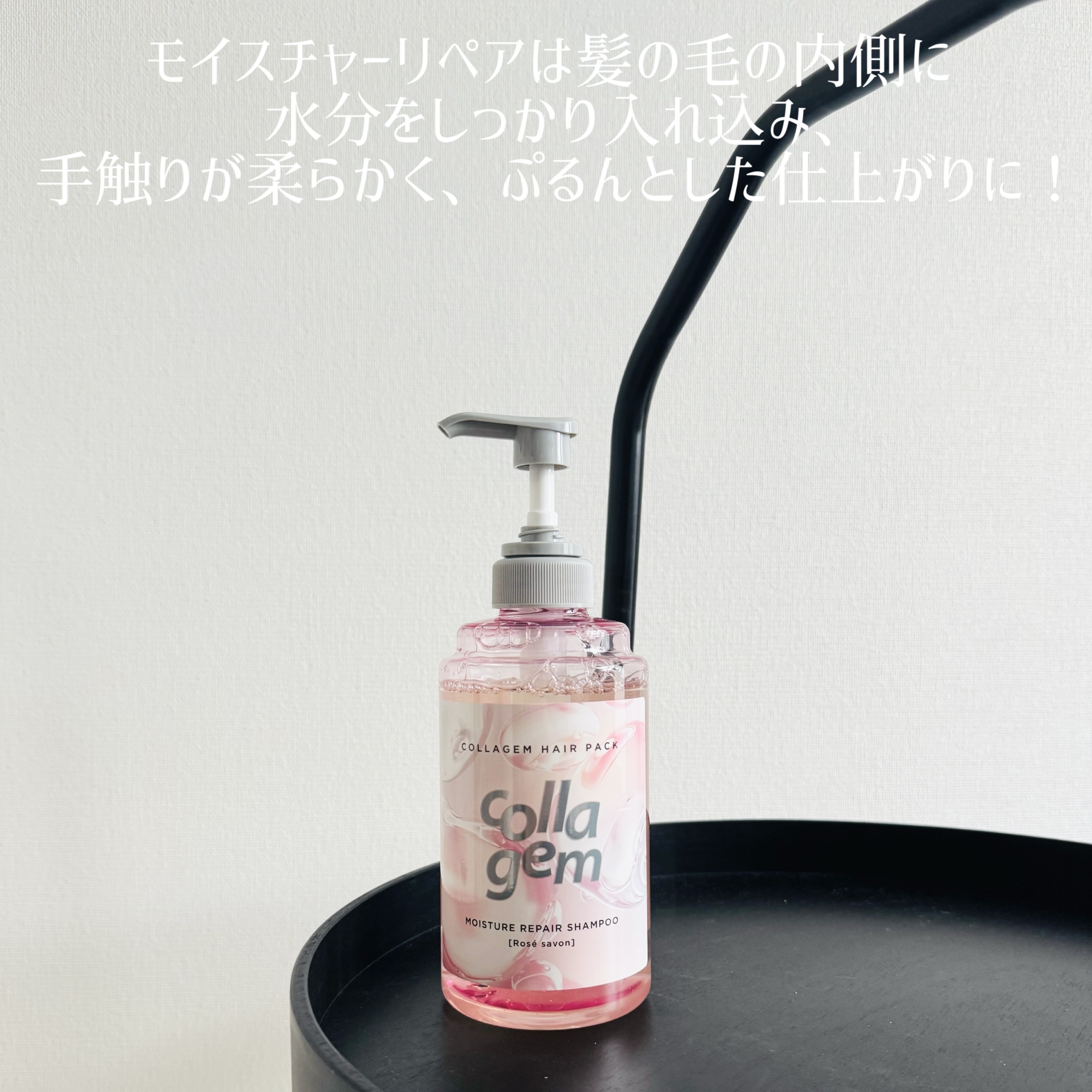 - 洗うだけで、濃密コラーゲンヘアパック※1,4,5,6 「コラジェム モイスチャーリペアシャンプー&トリートメント」 コラーゲン由来の洗浄成分※1配合(※シャンプーのみ) 乾燥・パサつく髪に【高浸透&保水】 まとまる、ぷるうる髪へ ◎リッチハイドレーション処方 【髪内部の崩れた保水の構造※2を補修】 パサついて硬くなった髪をなめらかに ➀スクワラン※3 髪内部に浸透し、潤いとしなやかさを与える ➁モイスチャーオイル※4 髪を補修・保護し、なめらかな手触りに 【コラーゲン美容補修成分※5,6】 ➀デュアルリペアコラーゲン※5 大きさが違う2つのコラーゲンが 内部と外部から潤い浸透、洗うたび補修 ➁ヒートケアコラーゲンMIX※6,7 熱を味方にしてアイロンなどの熱ダメージから キューティクルを補修・保護 「ほんのり甘く透明感のある ロゼサボンの香り で癒しのバスタイムに」 ※1 ココイル加水分解コラーゲンK(洗浄成分) ※2 毛髪の水分と油分のバランスのこと ※3 エモリエント成分 ※4 マカデミア種子油、ヒマワリ種子油(すべてエモリエント成分) ※5 サクシノイルアテロコラーゲン、加水分解コラーゲン(すべて毛髪補修成分) ※6 加水分解コラーゲンPGプロピルメチルシランジオール(毛髪補修成分) ※7 グルコシルヘスペリジン(保湿成分)