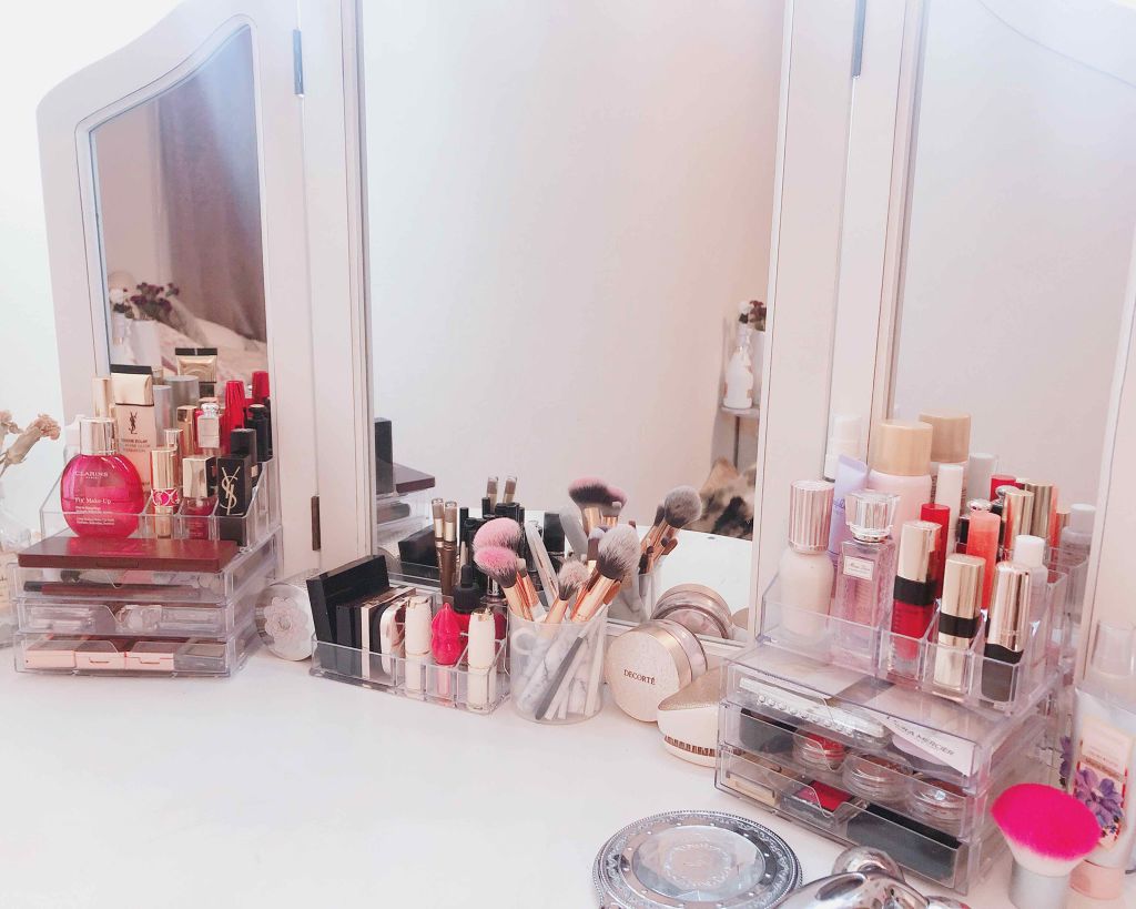 コスメ収納紹介3段クリアケース以外も多分ダイソーだけどもう売っていないかもおでかけ用お泊り用ポーチとその他パック以外はほぼ全て大集合低めの机だから置いてあるだけでメイクは別の場所へ推し活とコスメが両立出来るようコスメの数を減らしてグッズを置け...