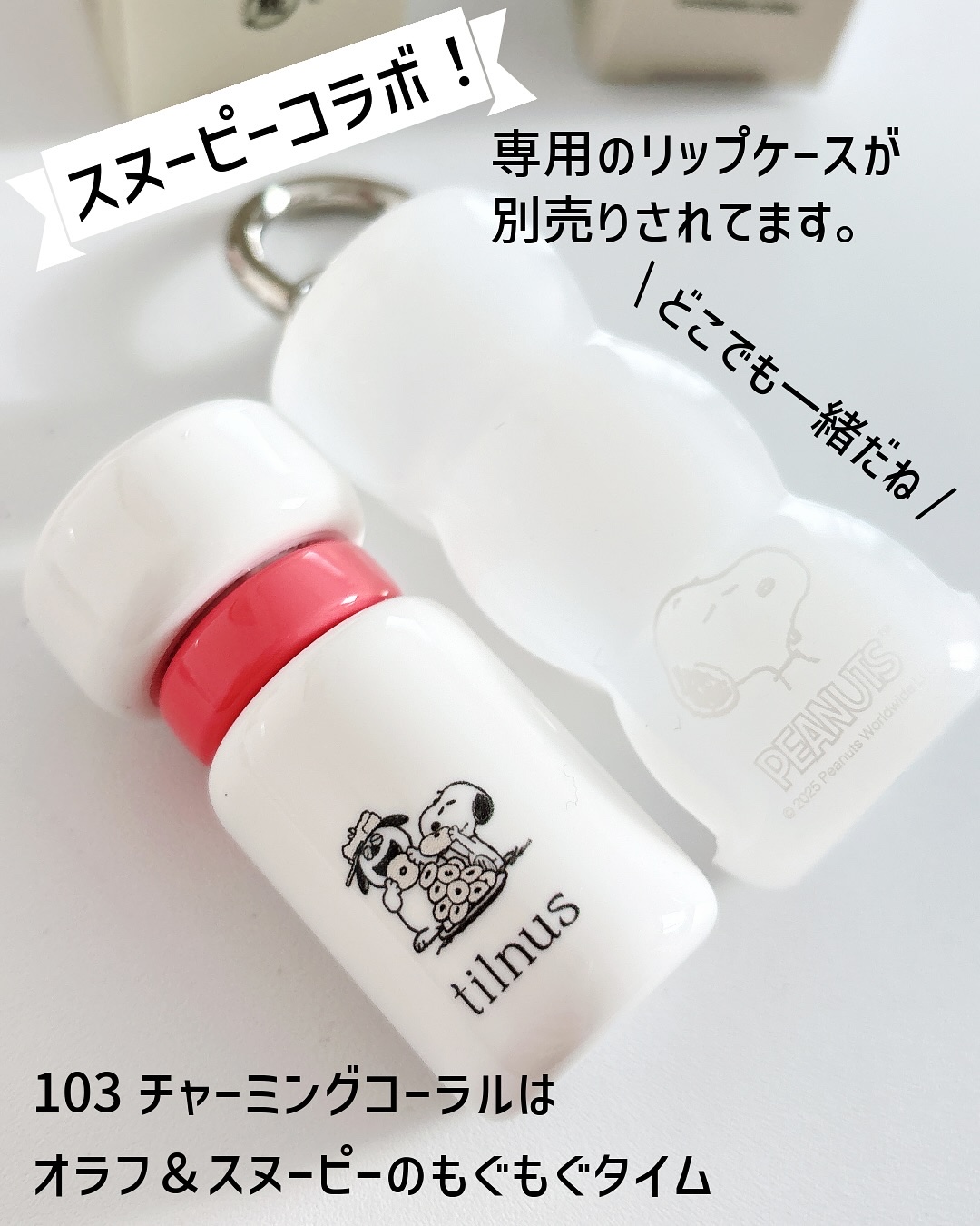 1分待つとラメが浮き出てくるリップ?!✨ティルナスのサンリットパールティントがスヌーピーとコラボしてたので購入しちゃいましたー!!なんとね!!!リップケースもスヌーピーになってたのでケースも買っちゃった、、🤦♀️🤍価格1500円🤍色味S10...