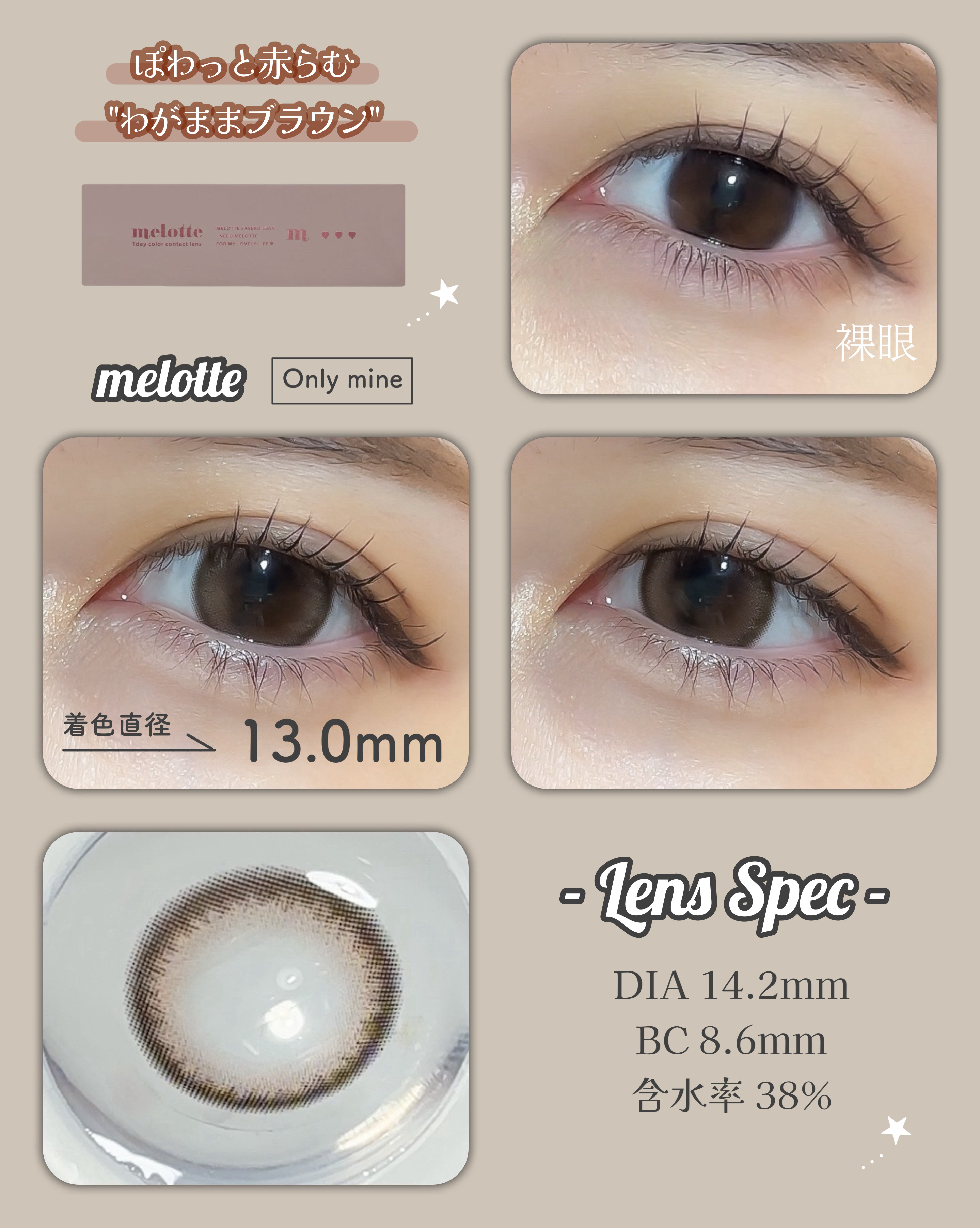 〖melotte待望の新色レンズ!〗\大人も使いやすいナチュラル盛り!/❤︎melotte✓DIA14.2mm✓BC8.6mm✓着色直径13.0mm✓含水率38%✓使用期限1day吉田朱里さんプロ...