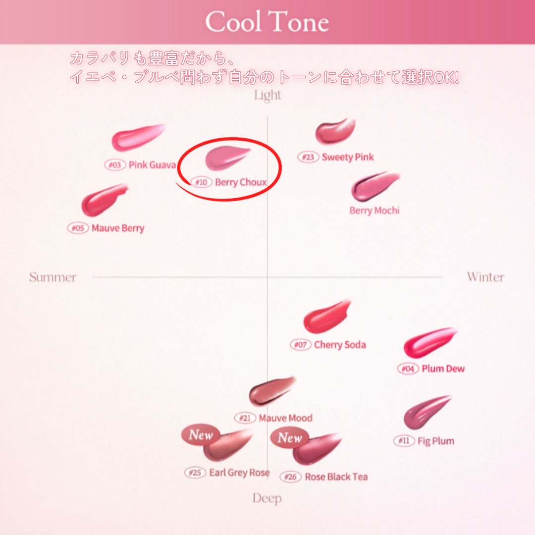 - スイートなフルーツカラーが薄く密着して、ベタつきを防いで水分たっぷりの果汁コーディングを完成させます。 ウォームトーンからクールトーンまで揃い、顔色を華やかに照らしてくれます。 【Point1】ミルキーなローズカラーが唇の本来のカラー感ときれいに馴染みます。 【Point2】水分を含んだしっとりとしたフォーミュラがベタつかず密着してきれいに満たされる水分膜コーティング。ソフトなミルキーローズカラーが時間が経つほど奥ゆかしいディープローズカラーに変化します。 【Point3】1日中透明で澄んだ生気ティント。発色そのまま着色して長持ちする鮮やかなカラー感を演出します。