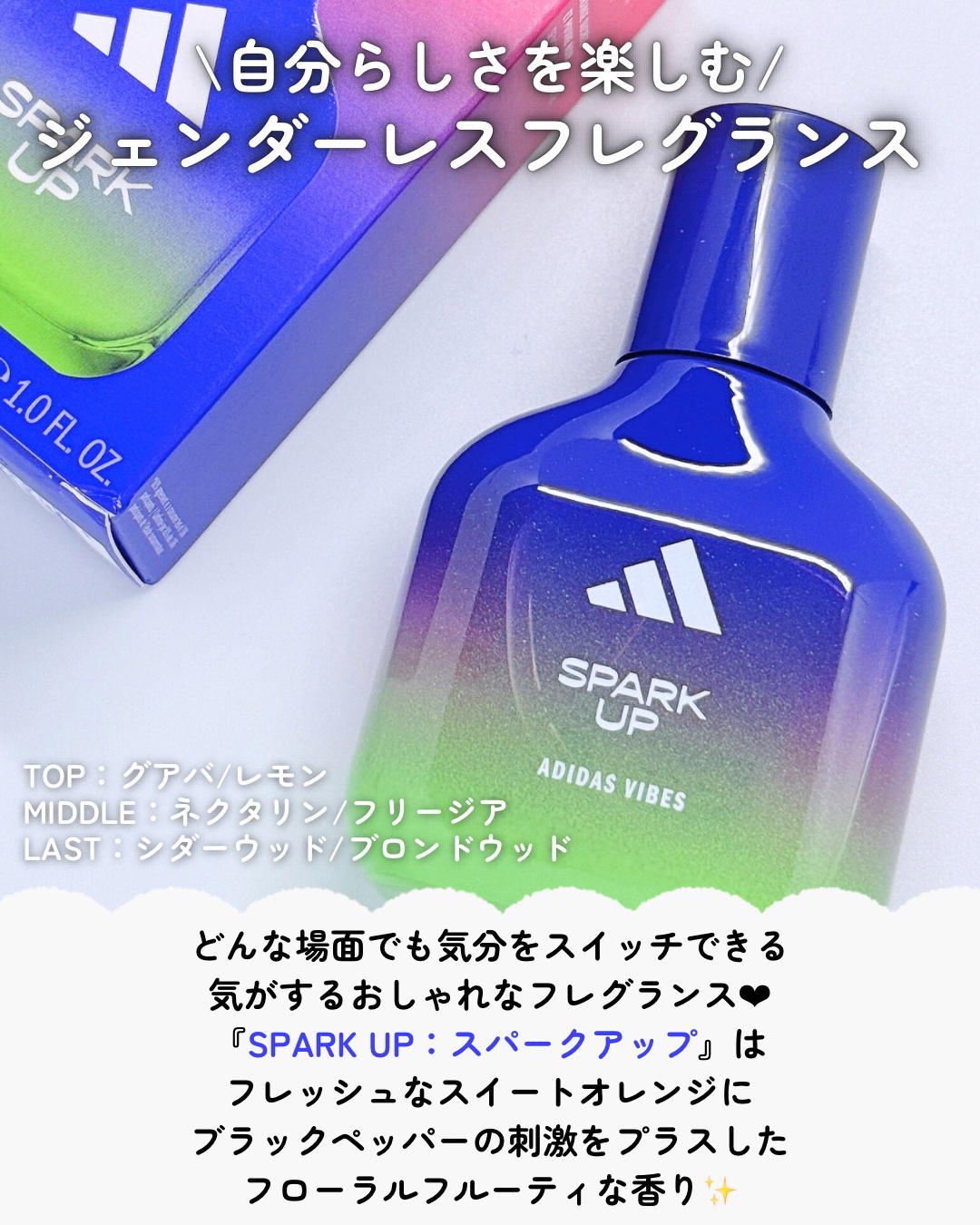 - adidas がスポーツやカルチャーにおいて築いてきた伝統にインスパイアされた新しい 6 種のオードパルファムは、活発で変化に満ちた現代の日常を反映しながら、ポジティブなムードを呼び起こします。 また、キャンバスに見立てたボトルは色彩と躍動感にあふれ、あらゆる人に親しまれる adidas のダイナミックなスピリットを体現しています。 スパークアップ : ポジティブムードあふれる、フレッシュなスウィートオレンジとブラックペッパーの香り。