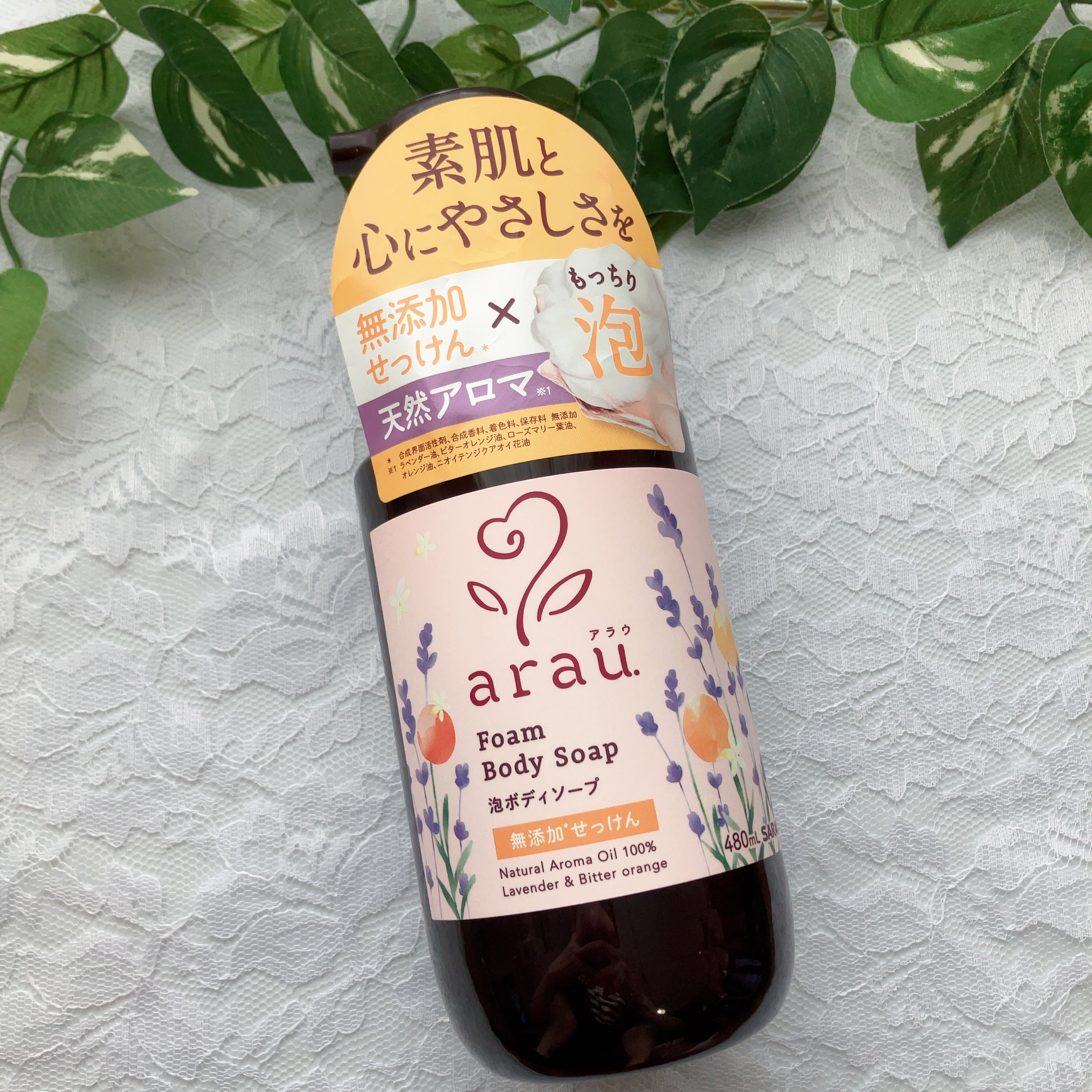 アラウ.泡ボディソープを使ってみました。植物生まれのせっけん成分でできている人気のシリーズの限定発売の泡ボディソープです。天然のアロマオイルの香りの無添加せっけんのボディソープです。合成界面活性剤や、合成香料、着色料、保存料は無添加です。ポン...