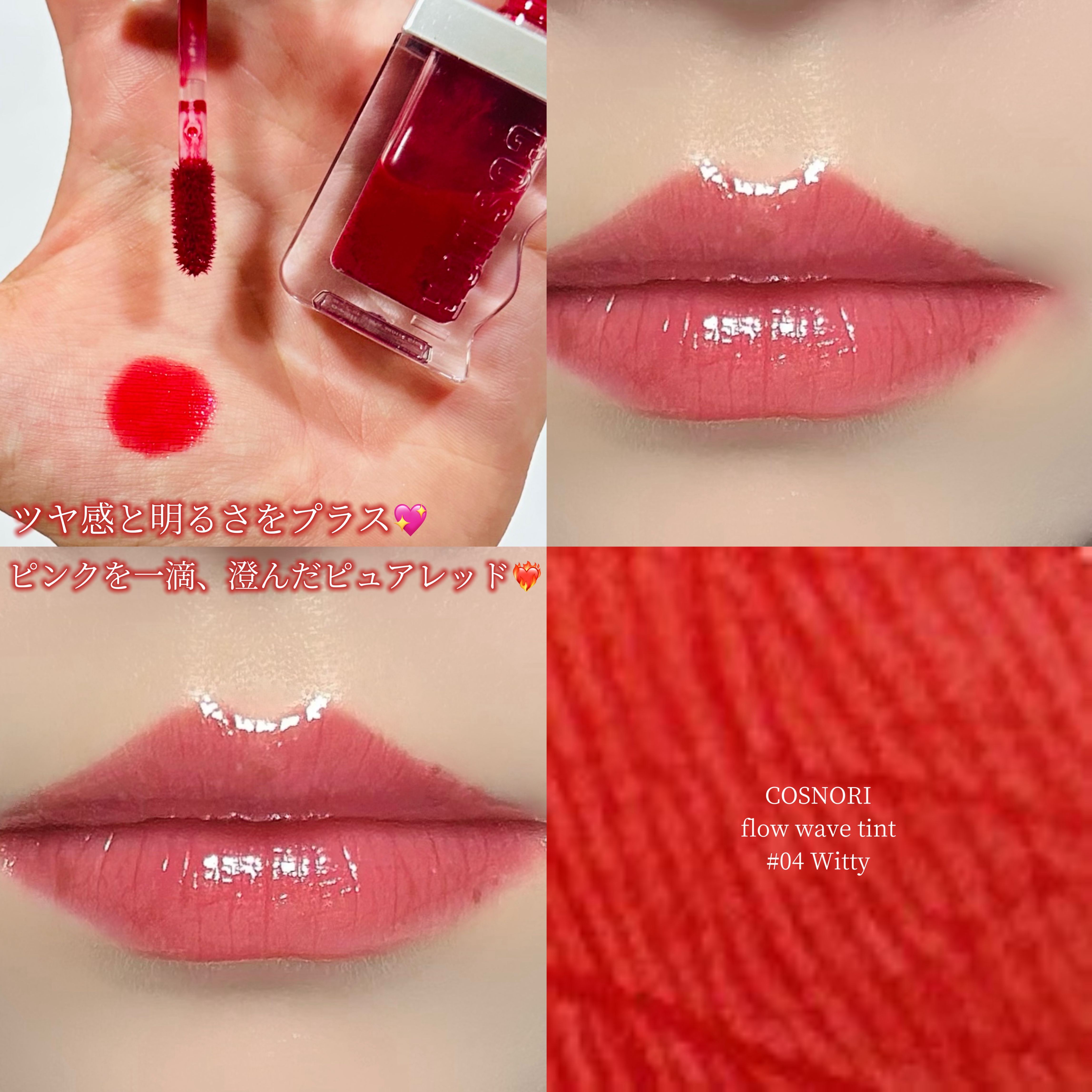 - クリアに満ち溢れる3層ガラス玉光沢がかわいい!コスノリからカラーリップが登場! 軽い付け心地なのにしっかりうるつや・ウォーターエッセンス38%とオイルのこだわりの配合率で、べたつかずに軽いフィッティングでツヤを演出します。 植物由来保湿オイルで唇にやさしい使い心地、しっとりした保湿効果が持続します。 1度塗りでシアーなナチュラルつや感、2.3度重ね塗りをすることで、ガラス玉のようなぽってり*うるツヤ唇へ導きます。 *メイク効果