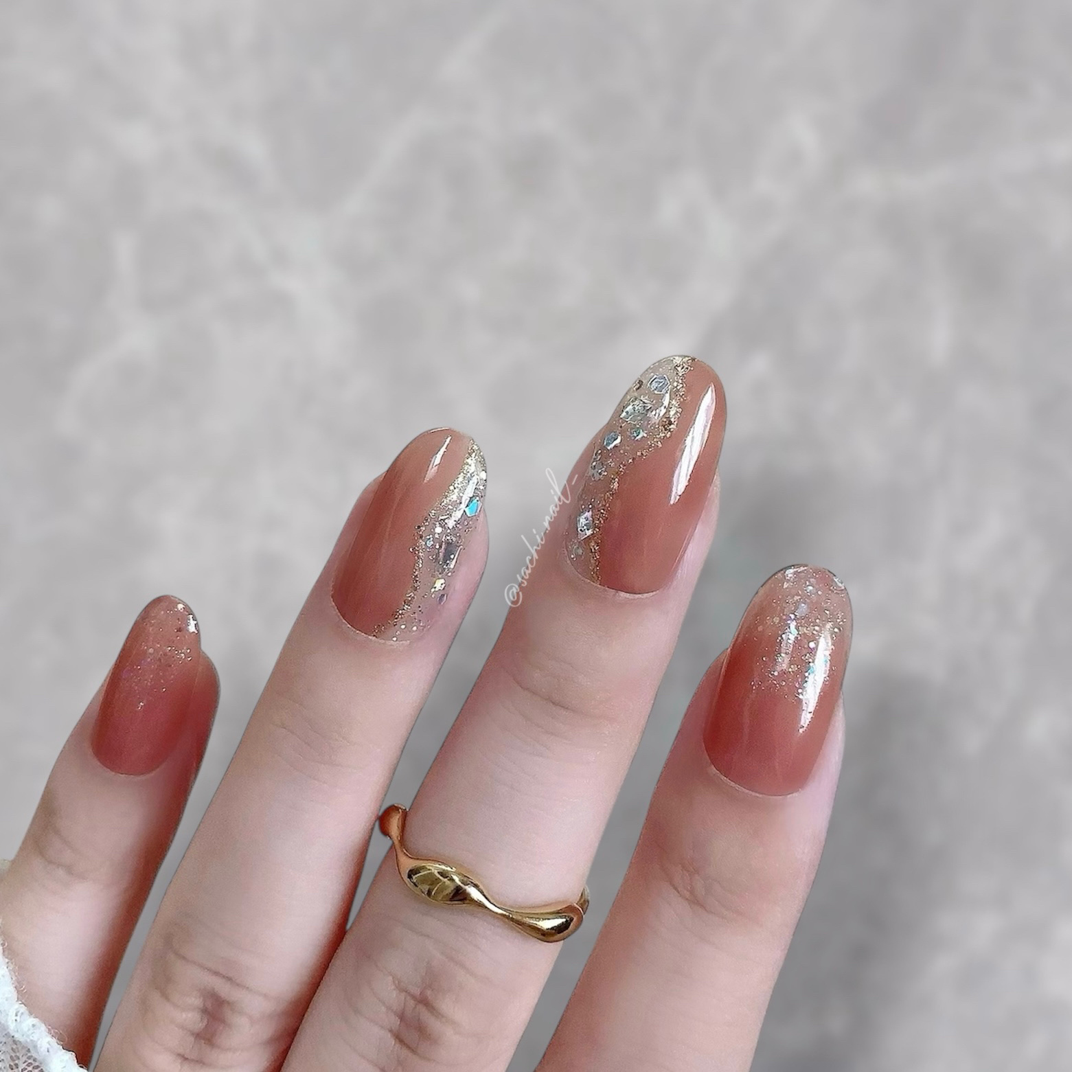 ワンカラーでも指ごとに色を変えるだけでオシャレに見えます💕 画像のようにゴールドラインとストーンを少し足すだけで華やかさがアップ🥰 何度かご紹介したことのあるスポンジで作るグラデーションです✨ スポンジを使うことで境目が綺麗に馴染んでくれます💕 アルミホイルの上でブラウンとトップコートを1:1くらいで混ぜたものを、トップコートのハケに取って3箇所に塗るだけ👌 事前に混ぜたものを塗ることで、爪の上でぼかすより簡単に出来ます💕 ベースカラーが乾く前に点置きしてぼかすことで綺麗にぼかせます✨ スピードが大事なので、使うポリッシュのキャップは全て開けておきましょう😊 天然石のラインはガタガタの方がより天然石っぽく見えるので、ラインを描くのが苦手な方でも大丈夫🙆♀️ 難しそうに見えて、やってみると意外と簡単に出来ます♡