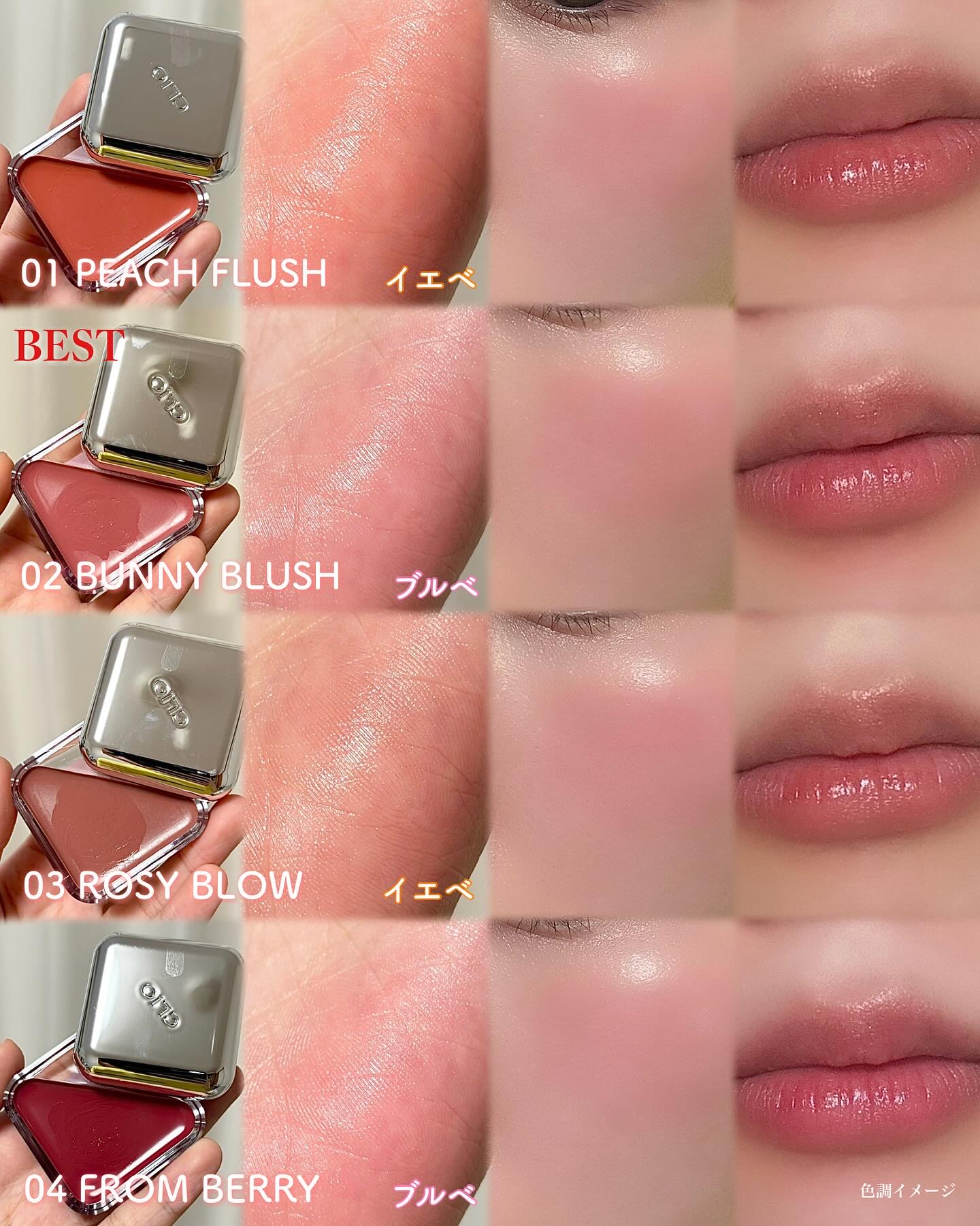 - ヘルシーで華やかな印象を叶える、リップやチークなどマルチに使える透明感のあるカラーのバーム。 <01 ピーチフラッシュ(PEACH FLUSH)> ヘルシーに表現されるピーチ コーラル カラー <02 バニーブラッシュ(BUNNY BLUSH)> 可愛らしく清純なベビーピンク カラー <03 ロージーブロー(ROSY BLOW)> 落ち着きのある成熟したロージーカラー <04 フロムベリー(FROW BERRY)> 紫色を一滴追加、デイリーベリーカラー <05 チェリーシャワー(CHERRY SHOWER)> イキイキとした血色感を与えるチェリー 果汁カラー <06 アップルガーデン(APPLE GARDEN)> クリアに満ちるレッドアップルカラー <07 アプリコット ブリーズ(APRICOT BREEZE)> やわらかい陽ざしのぬくもりを閉じ込めたサンキスドコーラル <08 バブリープラム(BUBLY PLUM)> 活気に満ちたライラックの花のように爽やかなライブリーパープル <100 シュガーリボン(SUGAR RIBBON)> ふんわり甘く、きゅんをひとさじしたようなローズピンクカラー