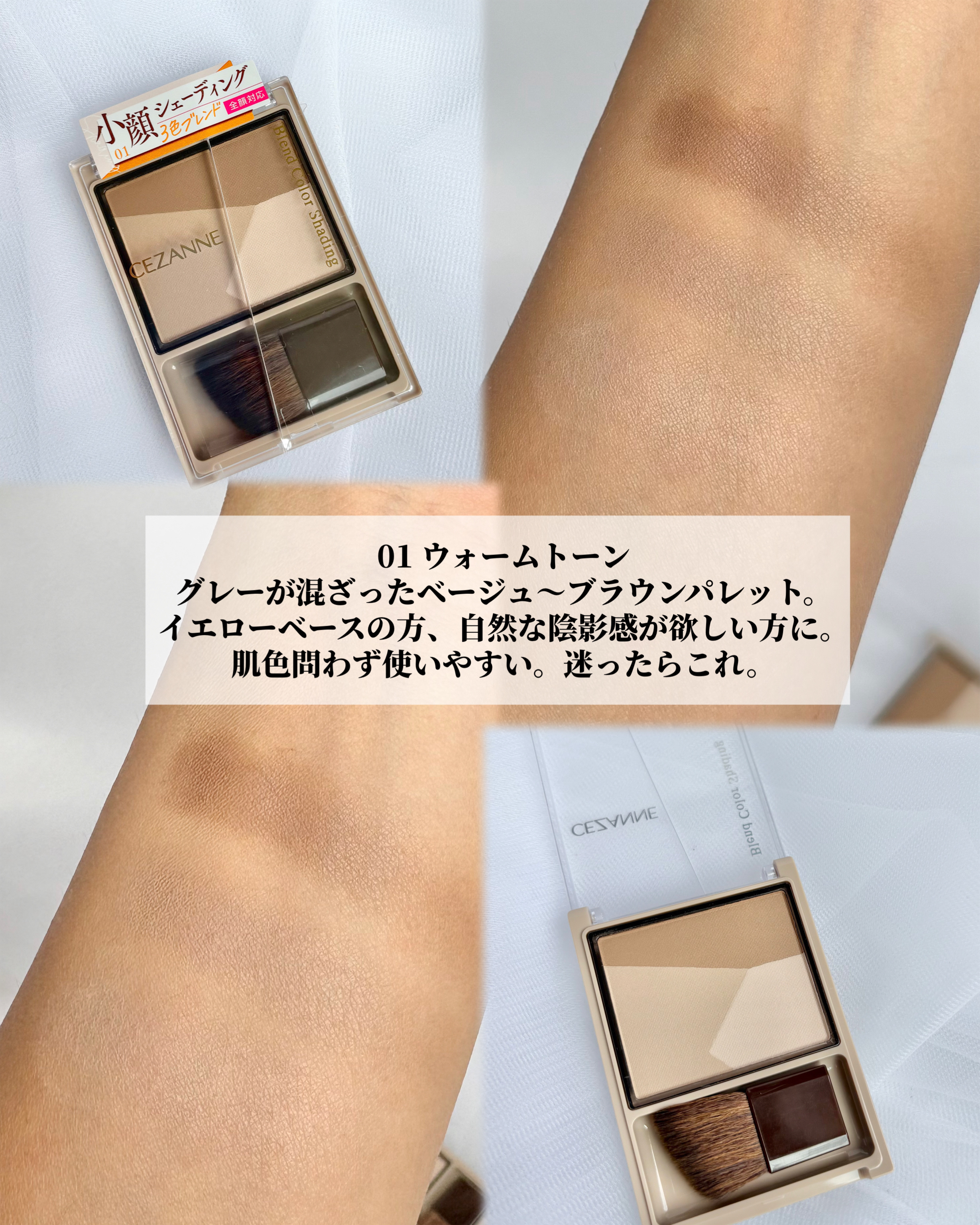 - 自然な陰影をプラスする3色グラデーションシェーディング。入れたい部分に合わせて濃淡・色味をぴったり調節できます。混ぜても一色ずつでも、使い方自由自在。 美容保湿成分(オリーブ果実油、バオバブ種子油、ヒアルロン酸Na)配合。 鼻筋にフィットする斜めカットブラシ付。 01 ウォームトーン:グレーが混ざったベージュ~ブラウンパレット。イエローベースの方、自然な陰影感が欲しい方に。肌色問わず使いやすい。迷ったらこれ。 02 クールトーン:グレーが混ざったベージュ~モーヴブラウンパレット。ブルーベースの方、より陰影感が欲しい方におすすめ。 03 メリハリトーン:マットなホワイトとグレーブラウンの組み合わせでメリハリ立体感を演出。肌色問わず使いやすい。 (ご使用方法) ブラシに適量を取り、輪郭や鼻筋の横など影を入れたい部分に塗布してください。単色はもちろん、お好きな色を混ぜてもお使いいただけます。 (使用上の注意) お肌に異常が生じていないかよく注意して使用してください。お肌に合わない時は、ご使用をおやめください。