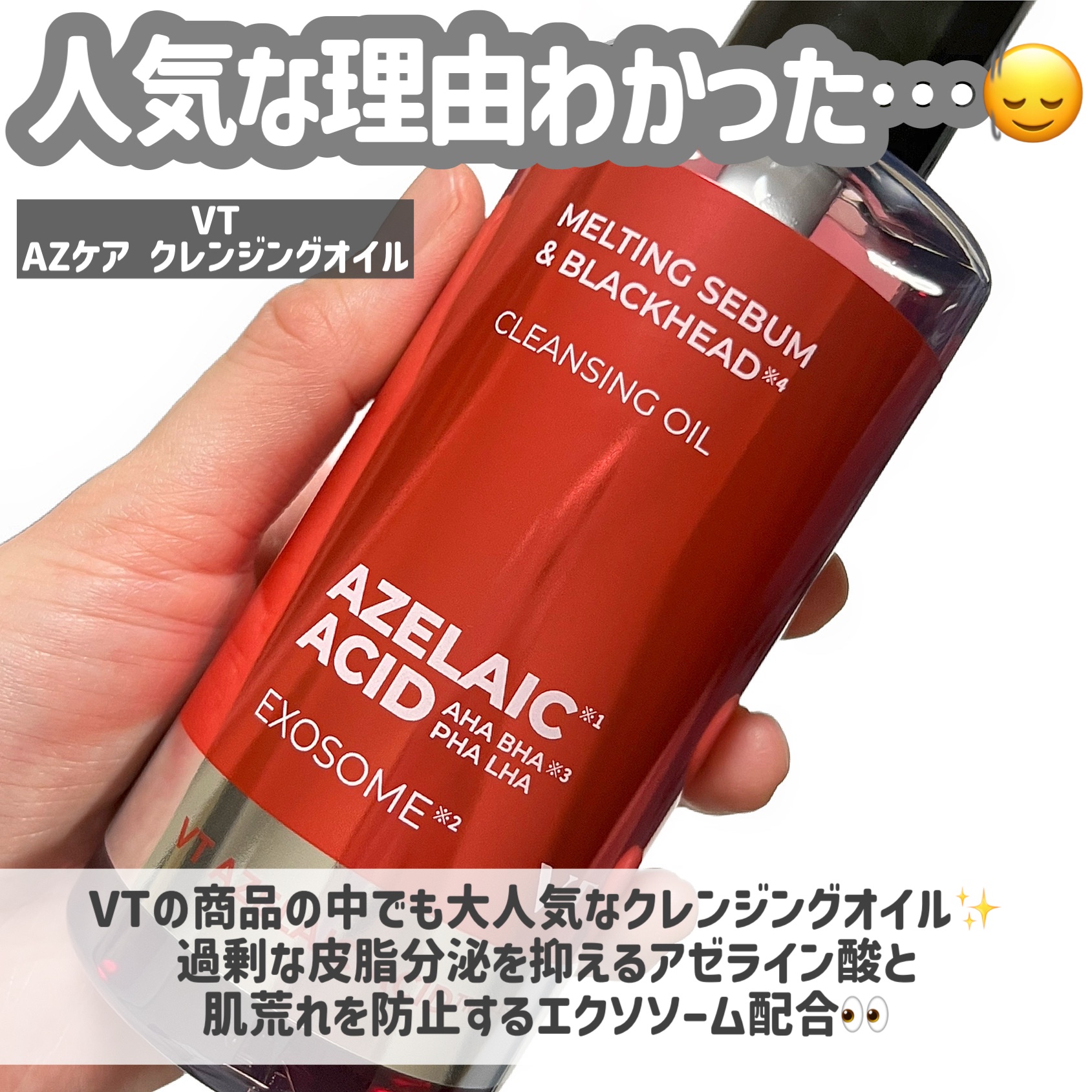 - 最近話題の毛穴ケア・整肌成分アゼライン酸!VTからはクレンジングオイルが登場! ポイントメイクまで落とすしっかりした洗浄力で、毛穴・皮脂までケアし保湿まで叶える一石三鳥アゼライン酸クレンジングオイル。 19種の植物性オイル*1も配合で、目に見えるブラッドヘッド*2から、隠れているホワイトヘッド*2、皮脂まですっきりケアします! ダブル洗顔不要! ※パッケージリニューアル ■このような方へおすすめ メイク・毛穴までディープクレンジング求める方 クレンジングでスキンケアまで行いたい方 ツッパリ感の少ないクレンジングを探していた方 ブラックヘッド*ケアも行いたい方 *1ダイズ油、アルガニアスピノサ核油、ユズ果実油、コメヌカ油、オタネニンジン種子油、アーモンド油、ザクロ種子油、リンゴ種子油、ホホバ種子油、ツバキ種子油、、バオバブ種子油、ユチャ種子油、ベニバナ種子油、ヒマワリ種子油、ヒポファエラムノイデス油、オリーブ果実油、アボカド油、アンズ核油、クロフサスグリ種子油(いずれも保湿) *2古い角質による