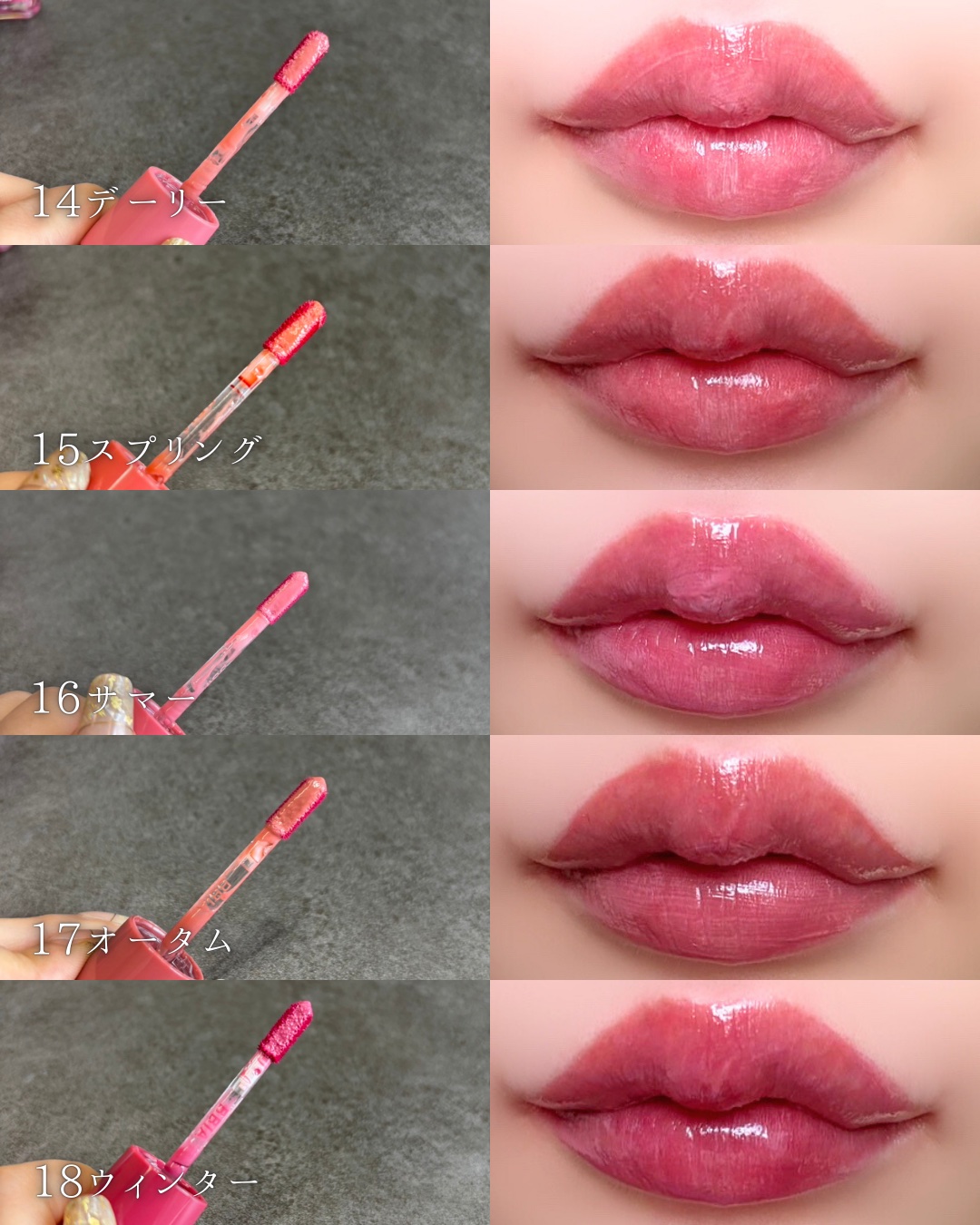 グロスっぽい塗り心地 ティントだから落ちにくい 個性的なカラーもあり 乾燥もしないし口紅がうるツヤです☺︎︎✨✨ 私が好きなカラーは1.2.3.6が好きです😘 008や010はすごく個性的だと思いました