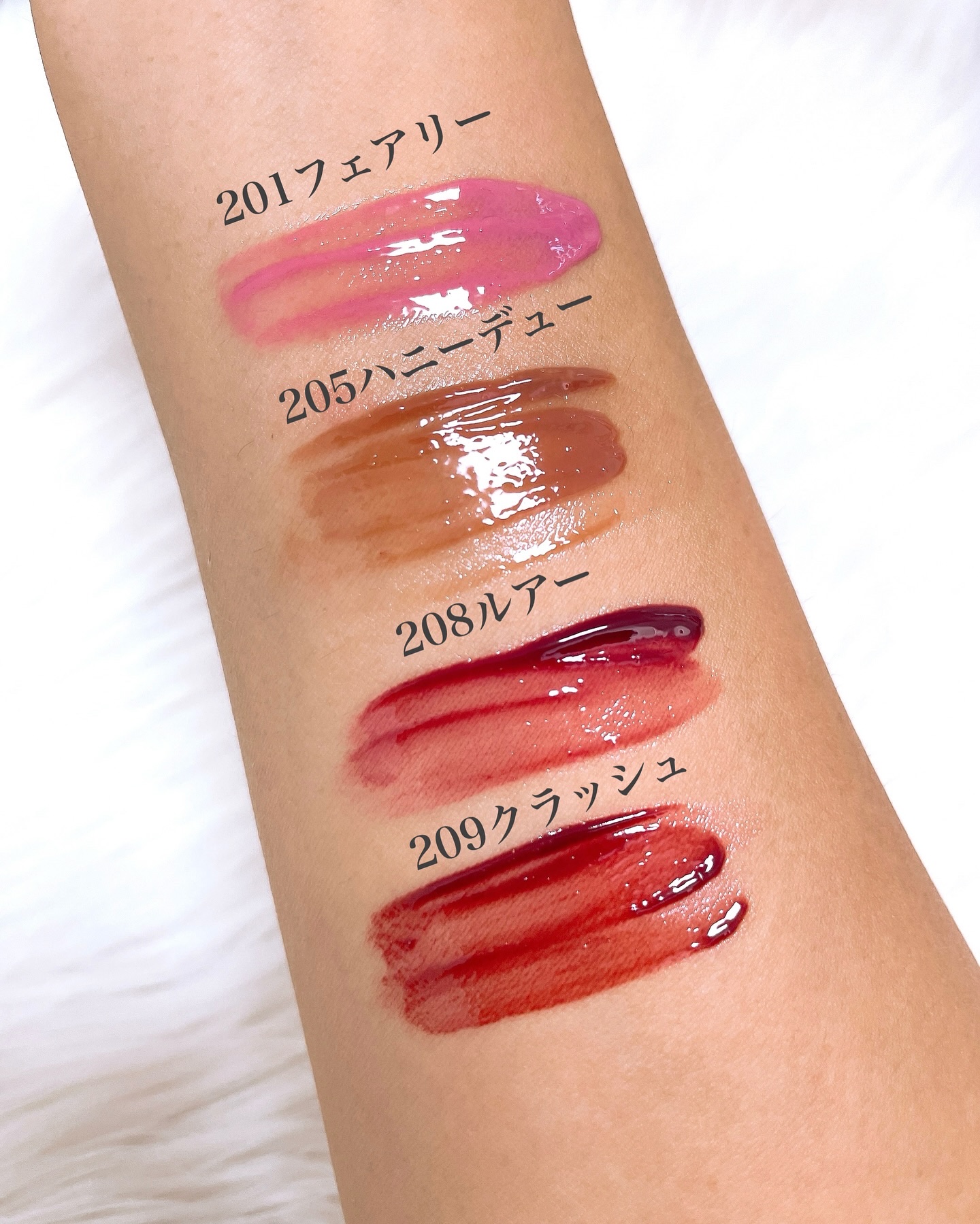 - <201 フェアリー> ダイマージリノール酸ジイソステアリル、ジフェニルシロキシフェニルトリメチコン、ビスジグリセリルポリアシルアジペート-2、水、ジフェニルジメチコン、水添ポリイソブテン、セチルPEG/PPG-10/1ジメチコン、ポリソルベート60、ペンチレングリコール、グリセリン、イソステアリン酸ポリグリセリル-4、フェノキシエタノール、1,2-ヘキサンジオール、セテアレス-20、酸化チタン (CI 77891)、(アクリル酸ヒドロキシエチル/アクリロイルジメチルタウリンNa)コポリマー、ステビオシド、スクワラン、香料、ジラウラミドグルタミドリシンNa、エチルヘキシルグリセリン、エチレンジアミンジコハク酸3Na、赤色227号 (CI 17200)、水酸化Al、黄色5号 (CI 15985)、ポリアクリル酸アンモニウム、イソステアリン酸ソルビタン、黄色4号 (CI 19140)、BG、赤色223号 (CI 45410)、青色1号 (CI 42090)、アラントイン、パンテノール、ツボクサエキス、ヒアルロン酸、加水分解ヒアルロン酸、ヒアルロン酸Na <203 バブリー> ダイマージリノール酸ジイソステアリル、ジフェニルシロキシフェニルトリメチコン、ビスジグリセリルポリアシルアジペート-2、水、ジフェニルジメチコン、水添ポリイソブテン、セチルPEG/PPG-10/1ジメチコン、ポリソルベート60、ペンチレングリコール、グリセリン、イソステアリン酸ポリグリセリル-4、フェノキシエタノール、1,2-ヘキサンジオール、セテアレス-20、(アクリル酸ヒドロキシエチル/アクリロイルジメチルタウリンNa)コポリマー、ステビオシド、酸化チタン (CI 77891)、スクワラン、香料、ジラウラミドグルタミドリシンNa、エチルヘキシルグリセリン、赤色227号 (CI 17200)、エチレンジアミンジコハク酸3Na、黄色5号 (CI 15985)、イソステアリン酸ソルビタン、水酸化Al、ポリアクリル酸アンモニウム、黄色4号 (CI 19140)、BG、青色1号 (CI 42090)、アラントイン、パンテノール、ツボクサエキス、ヒアルロン酸、加水分解ヒアルロン酸、ヒアルロン酸Na <204 レア> ダイマージリノール酸ジイソステアリル、ジフェニルシロキシフェニルトリメチコン、ビスジグリセリルポリアシルアジペート-2、水、ジフェニルジメチコン、水添ポリイソブテン、セチルPEG/PPG-10/1ジメチコン、ポリソルベート60、ペンチレングリコール、グリセリン、イソステアリン酸ポリグリセリル-4、フェノキシエタノール、1,2-ヘキサンジオール、セテアレス-20、(アクリル酸ヒドロキシエチル/アクリロイルジメチルタウリンNa)コポリマー、酸化チタン (CI 77891)、ステビオシド、スクワラン、香料、ジラウラミドグルタミドリシンNa、エチルヘキシルグリセリン、赤色227号 (CI 17200)、黄色5号 (CI 15985)、エチレンジアミンジコハク酸3Na、イソステアリン酸ソルビタン、水酸化Al、ポリアクリル酸アンモニウム、黄色4号 (CI 19140)、青色1号 (CI 42090)、BG、アラントイン、パンテノール、ツボクサエキス、ヒアルロン酸、加水分解ヒアルロン酸、ヒアルロン酸Na <205 ハニーデュー> ダイマージリノール酸ジイソステアリル、ジフェニルシロキシフェニルトリメチコン、ビスジグリセリルポリアシルアジペート-2、水、ジフェニルジメチコン、水添ポリイソブテン、セチルPEG/PPG-10/1ジメチコン、ポリソルベート60、ペンチレングリコール、グリセリン、イソステアリン酸ポリグリセリル-4、フェノキシエタノール、1,2-ヘキサンジオール、セテアレス-20、(アクリル酸ヒドロキシエチル/アクリロイルジメチルタウリンNa)コポリマー、酸化チタン (CI 77891)、ステビオシド、スクワラン、香料、ジラウラミドグルタミドリシンNa、エチルヘキシルグリセリン、赤色227号 (CI 17200)、黄色5号 (CI 15985)、エチレンジアミンジコハク酸3Na、イソステアリン酸ソルビタン、水酸化Al、ポリアクリル酸アンモニウム、黄色4号 (CI 19140)、青色1号 (CI 42090)、BG、アラントイン、パンテノール、ツボクサエキス、ヒアルロン酸、加水分解ヒアルロン酸、ヒアルロン酸Na <206 トフィー> ダイマージリノール酸ジイソステアリル、ジフェニルシロキシフェニルトリメチコン、ビスジグリセリルポリアシルアジペート-2、水、ジフェニルジメチコン、水添ポリイソブテン、セチルPEG/PPG-10/1ジメチコン、ポリソルベート60、ペンチレングリコール、グリセリン、イソステアリン酸ポリグリセリル-4、フェノキシエタノール、1,2-ヘキサンジオール、セテアレス-20、(アクリル酸ヒドロキシエチル/アクリロイルジメチルタウリンNa)コポリマー、ステビオシド、スクワラン、香料、ジラウラミドグルタミドリシンNa、酸化チタン (CI 77891)、エチルヘキシルグリセリン、黄色5号 (CI 15985)、エチレンジアミンジコハク酸3Na、黄色4号 (CI 19140)、赤色227号 (CI 17200)、イソステアリン酸ソルビタン、赤色223号 (CI 45410)、青色1号 (CI 42090)、水酸化Al、ポリアクリル酸アンモニウム、BG、アラントイン、パンテノール、ツボクサエキス、ヒアルロン酸、加水分解ヒアルロン酸、ヒアルロン酸Na <207 フレイム> ダイマージリノール酸ジイソステアリル、ジフェニルシロ