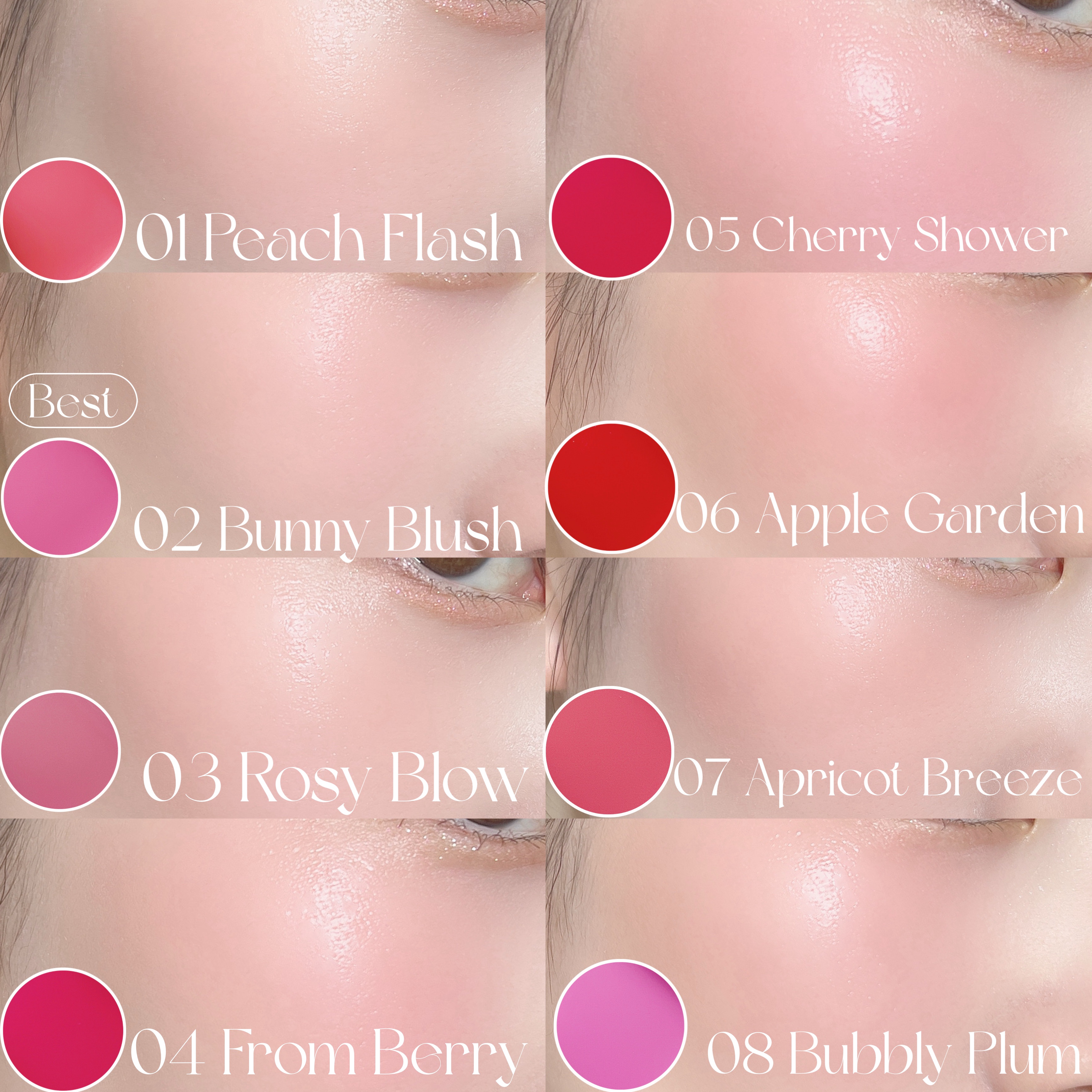 - ヘルシーで華やかな印象を叶える、リップやチークなどマルチに使える透明感のあるカラーのバーム。 <01 ピーチフラッシュ(PEACH FLUSH)> ヘルシーに表現されるピーチ コーラル カラー <02 バニーブラッシュ(BUNNY BLUSH)> 可愛らしく清純なベビーピンク カラー <03 ロージーブロー(ROSY BLOW)> 落ち着きのある成熟したロージーカラー <04 フロムベリー(FROW BERRY)> 紫色を一滴追加、デイリーベリーカラー <05 チェリーシャワー(CHERRY SHOWER)> イキイキとした血色感を与えるチェリー 果汁カラー <06 アップルガーデン(APPLE GARDEN)> クリアに満ちるレッドアップルカラー <07 アプリコット ブリーズ(APRICOT BREEZE)> やわらかい陽ざしのぬくもりを閉じ込めたサンキスドコーラル <08 バブリープラム(BUBLY PLUM)> 活気に満ちたライラックの花のように爽やかなライブリーパープル <100 シュガーリボン(SUGAR RIBBON)> ふんわり甘く、きゅんをひとさじしたようなローズピンクカラー