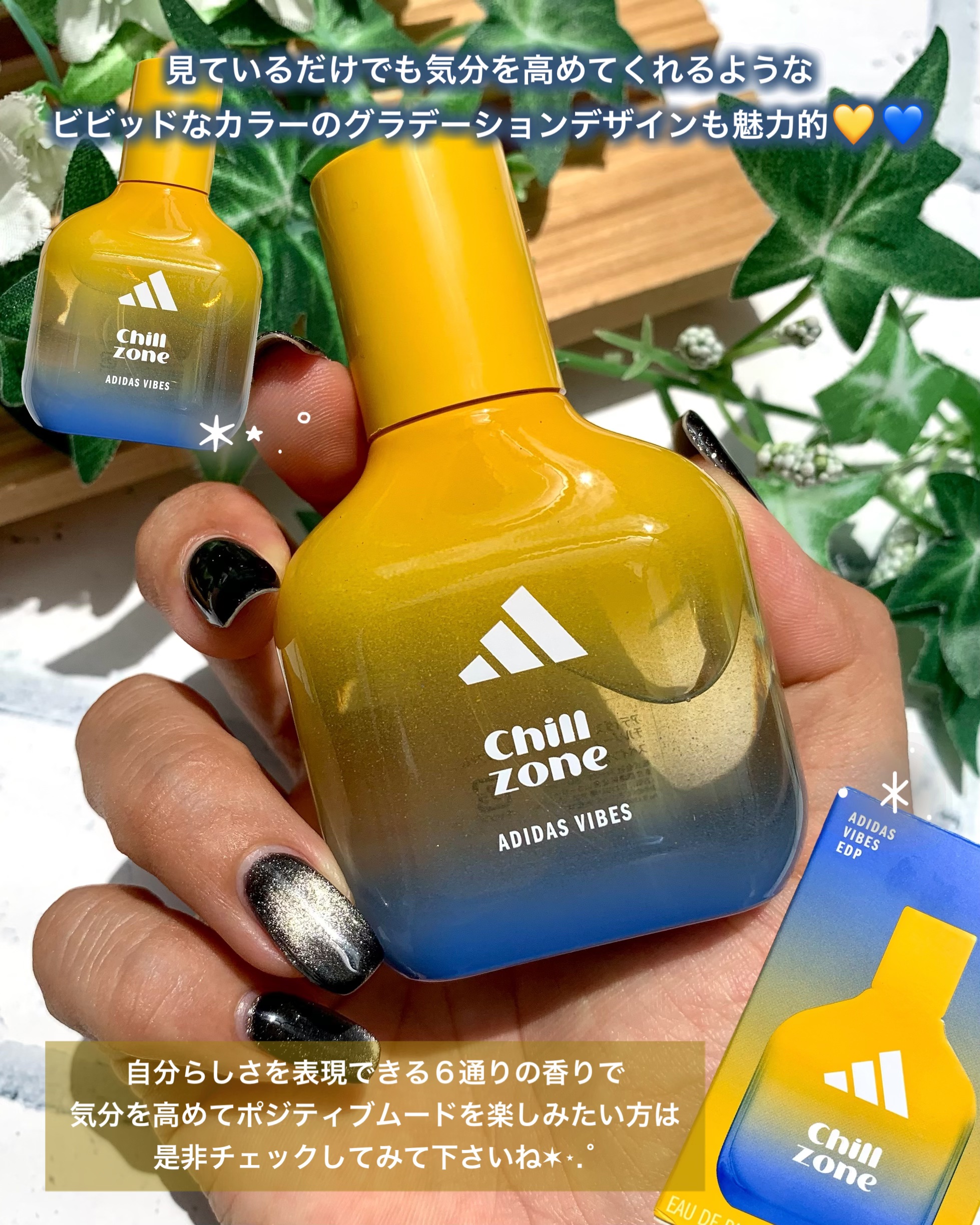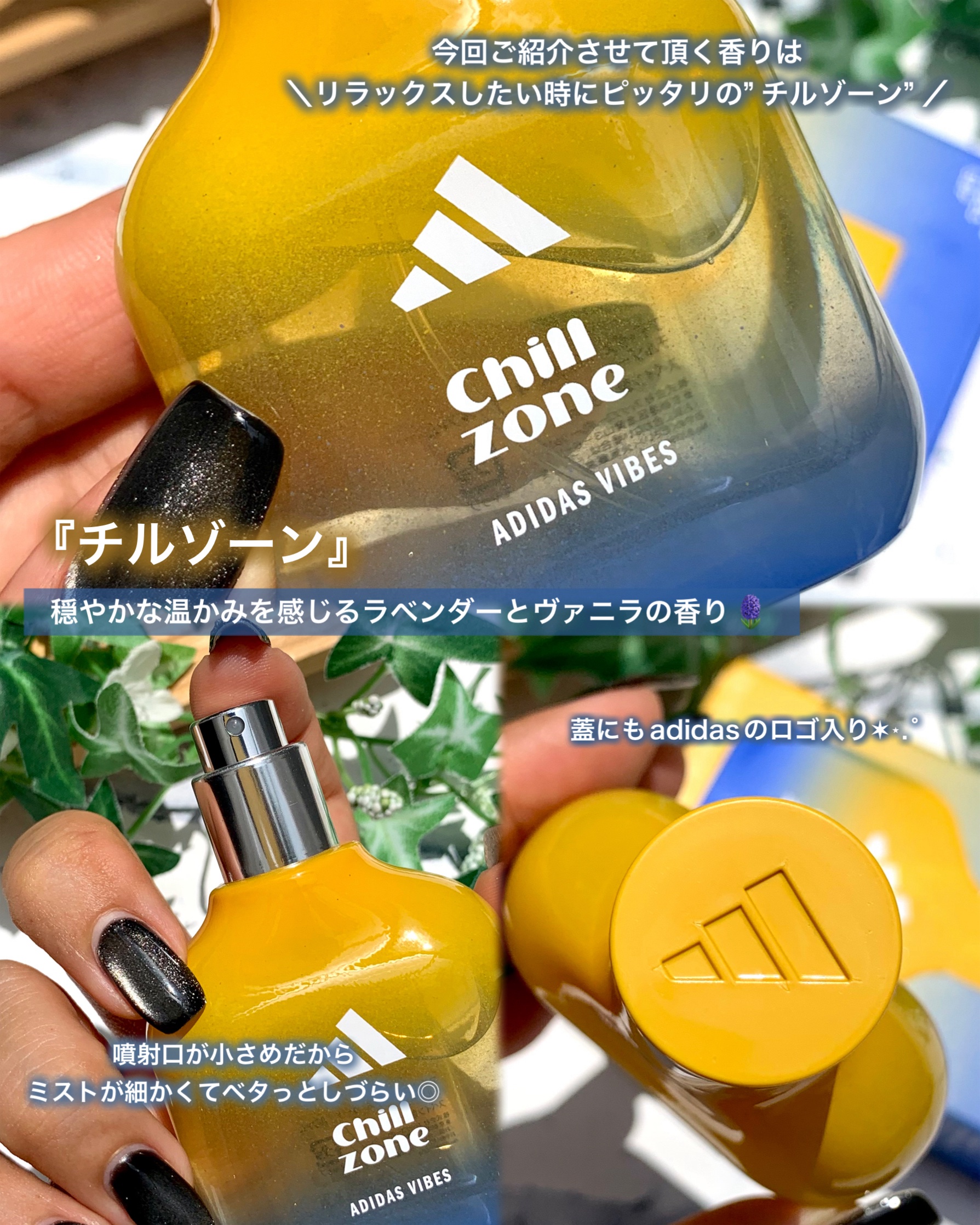 ♡adidasVibesChillZone心をふわっとリラックスさせてくれるユニセックスフレグランス🌿✨最初はジンジャーと洋ナシの爽やかな香りから始まり、やがてラベンダーとオリバナムがやさしく包み込みます︎︎☁最後はバニラとシダーウッド🌲🍨の...
