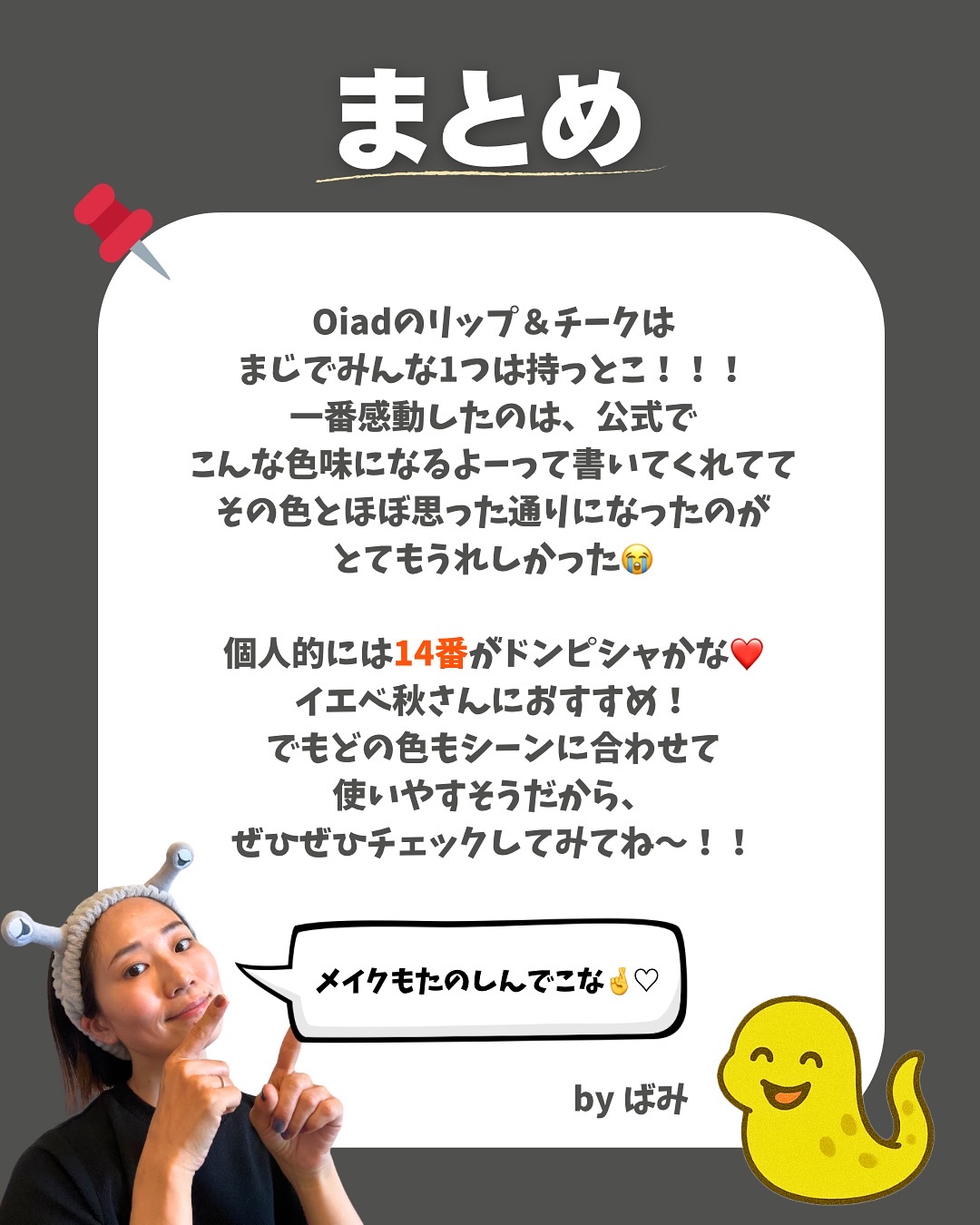 - 01. Primer mix プライマーとチークを融合した独特なテクスチャー 発色力と持続力が高くお肌にしっかりと密着、毛穴や凸凹を滑らかにカバー 02. Powdery Finish 雲のように軽くサラッとしたパウダリー仕上がり ムースクリームテクスチャーが高い発色力と持続力を実現、長時間自然な血色感が続きます。 03. Blurring & Fixing ムラになりにくくなめらかなブラーリングが可能 頬やまぶたなど広い面にサラサラ、ふんわりとぼかすことで自然なレイヤリングが可能 04. Radiant Color 一度のタッチできちんと発色 15カラーで表現するあなただけのムード 05. Multi-use Oiadのシルバーパースの特別なテクスチャーで叶える多様な使用方法 プライマーとチークを融合した独特なテクスチャーで チークだけでなくアイシャドウ、リップとしても使用できるマルチユーズチーク