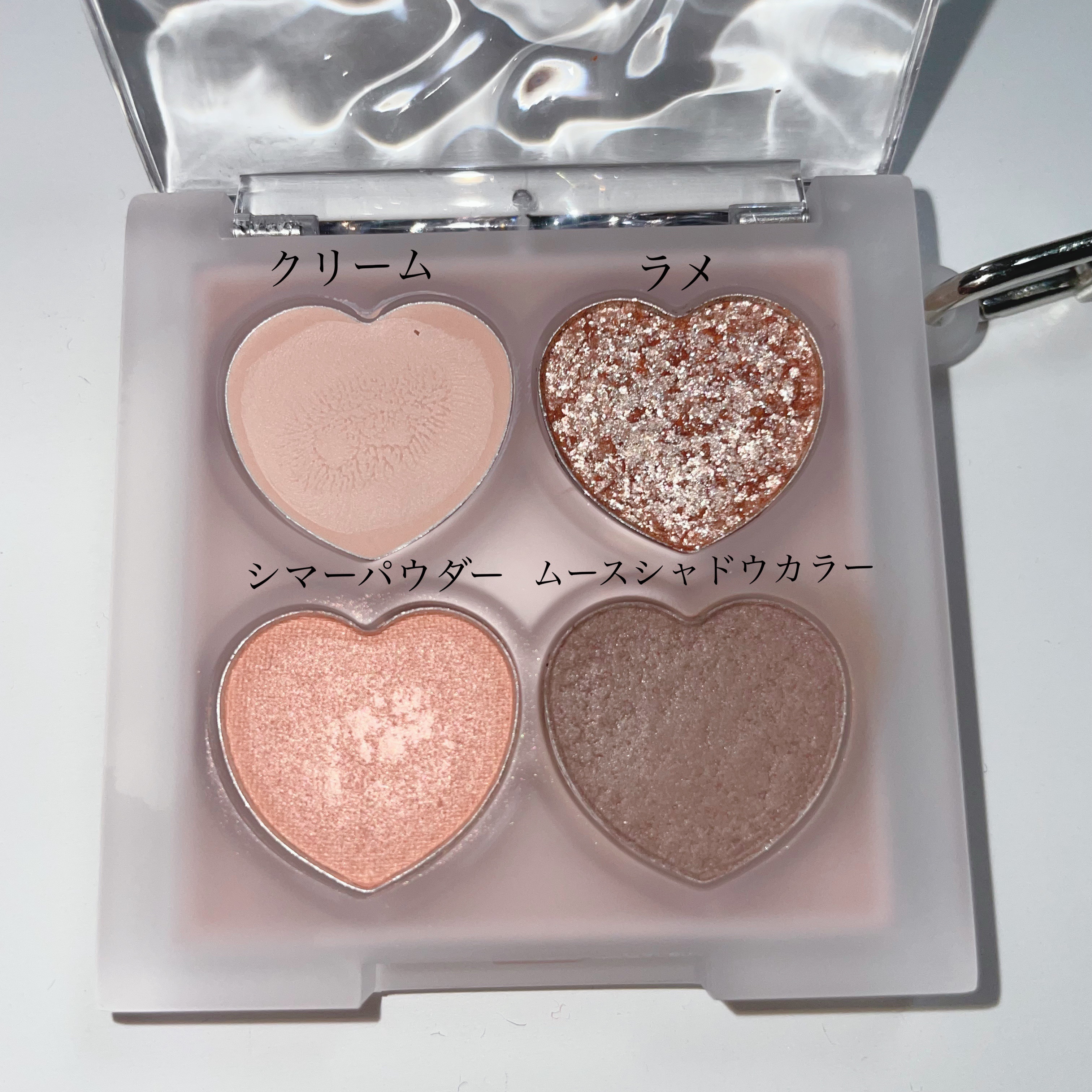 4つの質感を楽しみながら涙袋を作れるアイシャドウ🥰MilleFéeのぷくぷく涙袋パレット01シュガーベージュをスウォッチ✨️MilleFéeミルフィーぷくぷく涙袋パレット01シュガーベージュ可愛いハートとパールのチャーム付きできゅんってするコ...