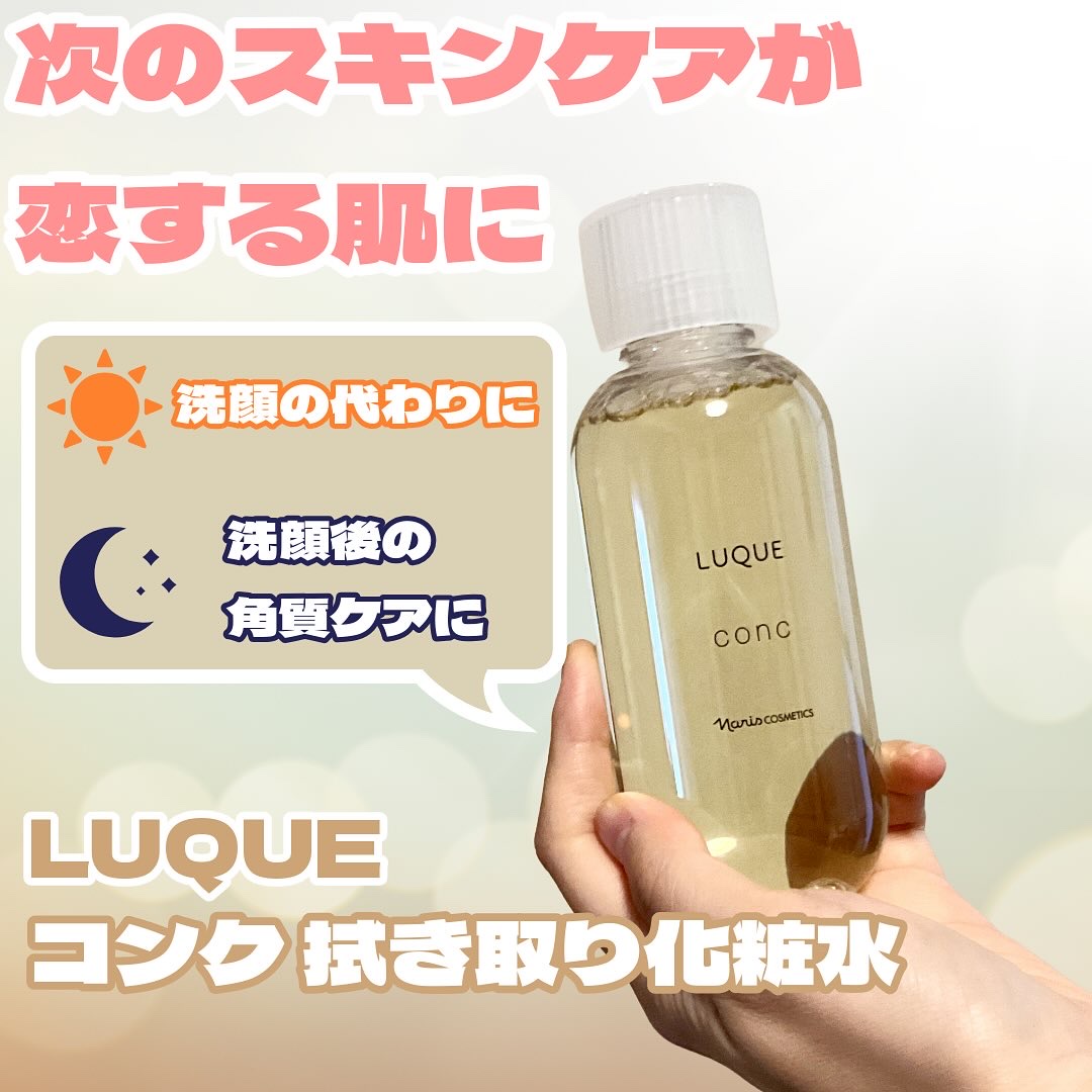 - ■毛穴、ザラつき、くすみ※1が気になる方に、不要な角質をふきとって、つるんとなめからかな肌へ。 ナリスのふきとり化粧水は、5年連続国内売上シェアNO.1※2 肌にとって余分な老化角質をおだやかに取り除き、素肌が持つ本来の美しさを引き出すルクエのコンク(ふきとり用化粧水)はナリスの80年以上続く研究開発によって誕生しました。 ●キレイのこたえは、ふきとり化粧水という選択。 植物保湿成分で古い角質をやさしくオフして、次に使うスキンケアアイテムのなじみをサポート。日々変化する肌をすこやかに整えます。毎日の“ふきとり習慣”で理想の肌に近づきましょう。 ●厳選した3つの植物の力で角層ケアをサポート。 ・柔らかくほぐして、取り除きやすくする「ヨクイニンエキス」※3 ・潤いを与え、健康的な角層へ導く「月見草エキス」※4 ・潤いを逃さず閉じ込める「白花豆エキス」※5 【使用方法】 1. 朝晩2回、洗顔後の後に。 2. コットンに8〜10滴程度(500円玉大)を含ませます。目安は、コットン裏側に染み込む程度。 3. できるだけ力を入れずに、やさしくなでるように顔全体を拭き取ります。 ※1古い角質による ※2ナリス化粧品 2015~2019年度 「ふきとり用化粧水」販売動向調査 TPCマーケティングリサーチ株式会社調べ※3 ハトムギ種子エキス(保湿成分) ※4 メマツヨイグサ種子エキス(保湿成分) ※5ベニバナインゲン種子エキス(保湿成分)