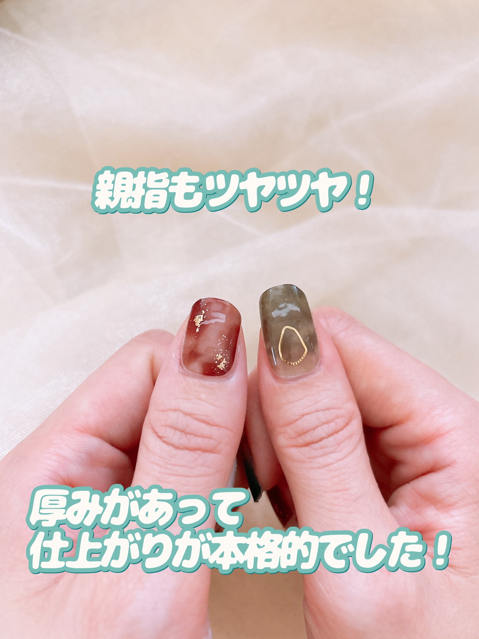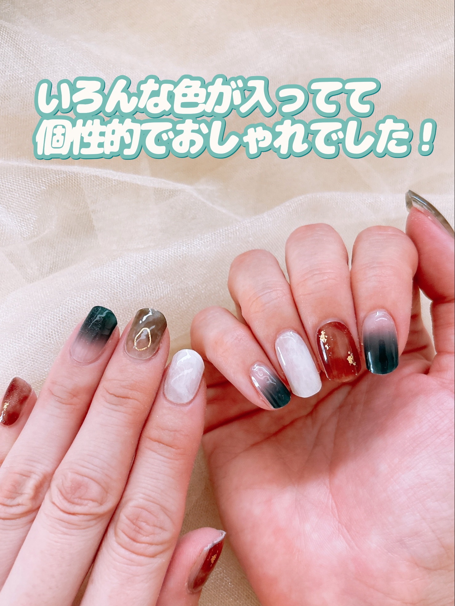 子どもの手でもこんなに大人っぽくステキに仕上がります! 本来は大人用なので、短い爪や丸い爪、小さな爪の方にもおすすめです😊 秋にピッタリなデザインもたくさんありました🍂 ネイルのもちは1日程度とおもっておいたほうがよさそう!特に表面の透明な層がよく剥がれるのだとか💦